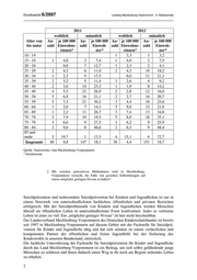 Landtag Mecklenburg-Vorpommern - 6. Wahlperiode Drucksache 6/2997 F92 Kombinierte Störung des Sozialverhaltens und der Emotionen Geschlecht Jahr gesamt 0-1 1-5 5 - 10 10 - 15 15 - 20 - 25 - 30 - 35 - 40 - 45 - 50 - 55 - 60 - 65 - 70 - 75 - 80 - >=85 20 25 30 35 40 45 50 55 60 65 70 75 80 85 weiblich 2011 137 0 0 8 78 50 1 0 0 0 0 0 0 0 0 0 0 0 0 0 2012 173 0 0 13 89 69 0 1 0 0 0 0 0 0 0 0 0 1 0 0 männlich 2011 206 0 0 25 115 66 0 0 0 0 0 0 0 0 0 0 0 0 0 0 2012 167 0 0 37 79 51 0 0 0 0 0 0 0 0 0 0 0 0 0 0 F93 Emotionale Störungen des Kindesalters Geschlecht Jahr gesamt 0-1 1-5 5 - 10 10 - 15 15 - 20 20 - 25 - 30 - 35 35 - 40 - 45 45 - 50 - 55 55 - 60 - 65 - 70 - 75 - 80 - >=85 25 30 40 50 60 65 70 75 80 85 weiblich 2011 56 0 1 17 33 5 0 0 0 0 0 0 0 0 0 0 0 0 0 0 2012 173 0 0 13 89 69 0 1 0 0 0 0 0 0 0 0 0 1 0 0 männlich 2011 48 0 1 19 25 3 0 0 0 0 0 0 0 0 0 0 0 0 0 0 2012 50 0 1 16 31 2 0 0 0 0 0 0 0 0 0 0 0 0 0 0 F94 Störungen sozialer Funktionen mit Beginn in der Kindheit und Jugend Geschlecht Jahr gesamt 0-1 1-5 5 - 10 10 - 15 15 - 20 - 25 25 - 30 - 35 35 - 40 40 - 45 - 50 - 55 55 - 60 - 65 - 70 - 75 - 80 - >=85 20 30 45 50 60 65 70 75 80 85 weiblich 2011 22 0 3 8 10 1 0 0 0 0 0 0 0 0 0 0 0 0 0 0 2012 16 0 1 6 8 1 0 0 0 0 0 0 0 0 0 0 0 0 0 0 männlich 2011 38 0 8 14 11 5 0 0 0 0 0 0 0 0 0 0 0 0 0 0 2012 41 0 2 13 21 5 0 0 0 0 0 0 0 0 0 0 0 0 0 0 9