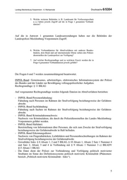 Drucksache 6/5354 Landtag Mecklenburg-Vorpommern - 6. Wahlperiode 4. Welchem Zweck dienen die in Frage 1 genannten Dateien/Daten- banken jeweils? INPOL M-V: Unterstützung der Landespolizei Mecklenburg-Vorpommern bei der Bewältigung vollzugspolizeilicher Aufgaben. Sie umfasst die nachstehenden Dateien. - INPOL M-V Personenfahndung: Fahndung nach Personen im Rahmen der Strafverfolgung beziehungsweise der Gefahren- abwehr. - INPOL M-V Sachfahndung: Fahndung nach Sachen im Rahmen der Strafverfolgung beziehungsweise der Gefahren- abwehr. - INPOL M-V Kriminalaktennachweis: Nachweis von Kriminalakten, die durch die Polizeidienststellen des Landes Mecklenburg- Vorpommern geführt werden. - INPOL M-V Haftdatei: Bereitstellung von Informationen über Personen, die sich zum Zwecke der Strafverfolgung beziehungsweise der Gefahrenabwehr in Haft befinden. - INPOL M-V Erkennungsdienst: Nachweis von Fingerabdrücken, Lichtbildern und Personenbeschreibungen im Rahmen der Strafverfolgung beziehungsweise der Gefahrenabwehr. DNA-Analyse-Datei M-V: Speicherung der DNA von untersuchten Personen und von Spuren zur Sicherung der Strafverfolgung beziehungsweise der Gefahrenabwehr. EVA: Elektronische Vorgangsbearbeitung im Tagebuchssystem. Bearbeitung und Auswertung von Informationen im Rahmen der Strafverfolgung, der Verfolgung von Ordnungswidrigkeiten sowie der Gefahrenabwehr. ZEUS: Zentrales Ermittlungs-Unterstützungs-System Erfassung von Daten aus Ermittlungsverfahren und Gefahrenabwehrvorgängen sowie der Auswertung dieser Daten und deren grafischer Darstellung. TLBS: Elektronisches Aufnahme- und Verarbeitungssystem erkennungsdienstlicher Daten von verdächtigen, beschuldigten und sonstigen Personen auf der Grundlage der unter Antwort 2 aufgeführten gesetzlichen Rechtsvorschriften. Bei Vorliegen der gesetzlichen Vorausset- zungen (§ 81 b 2. Alternative StPO beziehungsweise § 31 Absatz 1 Satz 2 SOG M-V) erfolgt die weitere Verarbeitung und Speicherung der mit dem TLBS erhobenen Daten im INPOL. 4