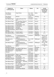 Drucksache 7/2115 Landtag Mecklenburg-Vorpommern - 7. Wahlperiode Mitglied der Messe Datum Ort Anzahl Landesregierung Unternehmen aus M-V als Aussteller Herr Minister Grüne Woche 20. - 22.01. Berlin 51 Dr. Backhaus 2017; 24.01. + 27.01.2017 Herr Minister BioFach 15.02. + Nürnberg 13 Dr. Backhaus 16.02.2017 Herr Minister Pegel CallCenterWorld (CCW) 21.02.2017 Berlin k. A. 2017 Herr Minister Pegel 18. Ausstellung “Bauen & 03.03.2017 Rostock k. A. Sanieren - Eigenheim” Herr Minister Glawe Internationale 08.03.2017 Berlin 21 Tourismusbörse (ITB) Herr Minister Glawe Lieferantentag 29.03.2017 Rostock 162 Herr Minister Glawe Autotrend 31.03.2017 Rostock 66 Herr Minister Pegel TransRussia 19.04.2017 Moskau 8 Herr Ministerpräsident Hannover Messe 24.04.2017 Hannover 39 Sellering Herr Minister Pegel transport logistic 10.05.2017 München 21 Frau Ministerin Hesse LebensArt Messe 15.07.2017 Kalkhorst, k. A. Gut Brook Frau Minister- 27. Mecklenburgische 14.09.2017 Mühlengeez Mehr als 100 präsidentin Schwesig Landwirtschaftsausstellung es gibt eine (MELA) Erhebung zur Herr Minister Dr. 27. Mecklenburgische 14. - 16. 09. Mühlengeez Zahl der Aus- Backhaus Landwirtschaftsausstellung 2017 steller (> (MELA) 1.000), jedoch Herr Minister Pegel 27. Mecklenburgische 15.09.2017 Mühlengeez nicht zur Zahl Landwirtschaftsausstellung der (MELA) Unternehmen Frau Minister- NEVA 19.09.2017 St. 18 präsidentin Schwesig Petersburg Frau Ministerin Hesse 20. JOBFACTORY Messe 22.09.2017 Rostock k. A. Herr Minister Pegel Breitbandforum 26.10.2017 Rostock 3 Herr Minister Dr. Grüne Woche 19. - 21.01. Berlin 54 Backhaus 2018; 23.01.2018 Frau Ministerin Hesse didacta - die Bildungsmesse 23.02.2018 Hannover k. A. Herr Minister Pegel CCW 2018 28.02.2018 Berlin 6 Frau Minister- Internationale 06.03.2018 Berlin präsidentin Schwesig Tourismusbörse (ITB) 07.03.2018 Herr Minister Glawe Internationale 06.03.2018 Berlin 53 Tourismusbörse (ITB) 07.03.2018 Herr Minister Pegel Internationale Tourismus- 07.03.2018 Berlin Börse (ITB) Herr Minister Pegel 19. Ausstellung “Bauen & 09.03.2018 Rostock k. A. Sanieren - Eigenheim” Herr Minister Glawe Lieferantentag 21.03.2018 Rostock 171 Herr Minister Glawe Autotrend 13.04.2018 Rostock 66 Herr Minister Pegel HANNOVER MESSE 23.04.2018 Hannover k. A. 2