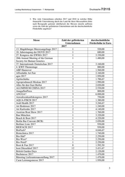 Landtag Mecklenburg-Vorpommern - 7. Wahlperiode Drucksache 7/2115 3. Wie viele Unternehmen erhielten 2017 und 2018 in welcher Höhe finanzielle Unterstützung durch das Land für ihren Messeauftritt (bitte nach Bezugsjahr getrennt tabellarisch die Messen einzeln auflisten sowie die Zahl der geförderten Unternehmen und die durchschnittliche Förderhöhe angeben)? Messe Zahl der geförderten durchschnittliche Unternehmen Förderhöhe in Euro 2017 13. Magdeburger Meeresangeltage 2017 1 520,00 18. Jahrestagung der DGVD 2017 1 680,00 27. Kongress der EWMA 2017 1 3.330,00 28th Annual Meeting of the German 1 1.480,00 Society for Human Genetics 37. Internationale Dentalschau 2017 1 3.160,00 4. KWF-Thementage 1 880,00 ABF Hannover 1 1.560,00 Affordable Art Fair 1 2.160,00 agra 2017 1 1.950,00 Agritechnika 3 1.786,67 Agroprodmasch Moskau 2017 1 1.990,00 Alles für den Gast Herbst 1 2.020,00 ALUMINIUM CHINA 2017 1 2.530,00 Anuga/bioPress 1 800,00 ANUGA* 3 6.000,00 Anwaltszukunftskongress 2017 1 750,00 AQUA-FISCH 2017 1 1.380,00 Arab Health 2017 3 3.246,67 Art Bodensee 2017 1 1.240,00 Art Karlsruhe 2017 2 4.140,00 Austrian Boat Show 2017 1 1.760,00 Bau München 1 3.320,00 Beach & Boot 2017 1 4.220,00 Berlin Bar Convent (BCB) 1 2.050,00 Berliner Liste 2017 1 930,00 BIOFACH 2017 1 930,00 BioFach* 6 4.646,67 Biotechnica 2017 1 1.740,00 Bio-Süd* 1 2.250,00 Bio-West* 1 2.250,00 Bio-Nord* 1 2.250,00 Boot & Fun 2017 8 1.592,50 boot Düsseldorf 2017 12 3.431,67 British Garden Days 1 2.120,00 Buchmesse 2017 1 1.470,00 Büroring Lieferantenausstellung 2017 1 1.470,00 Carat Leistungsmesse 2017 1 1.950,00 3