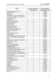 Landtag Mecklenburg-Vorpommern - 7. Wahlperiode Drucksache 7/2115 Messe Zahl der geförderten durchschnittliche Unternehmen Förderhöhe in Euro Frankfurter Buchmesse 2017 1 1.660,00 Gardiente 2017 1 1.020,00 GastRo* 2 565,00 GeoTHERM - expo & congress 2017 1 780,00 Golf- & WellnessReisen, Kreuzfahrt- & 1 630,00 SchiffsReisen 2017 h+h Colonge 1 4.820,00 Handwerk und Design 2 725,00 Hannover Messe 2017 11 2.134,54 Hanse Golf 2017 1 550,00 hanseboot 2017 8 4.050,00 Hanseschau Wismar* 5 636,00 Haus-Garten-Freizeit 1 3.350,00 Heim & Handwerk München 1 3.500,00 Home & Garden 2017 3 1.200,00 home² 1 2.760,00 Hygienalia Pulire 2017 1 1.680,00 IAA Frankfurt 1 1.650,00 IAW Internationale Aktionswarenmesse 3 3.220,00 IDS - 37. Internationale Dental-Schau 1 1.580,00 2017 Industriemesse, Chemnitzer Gefäßkurse 1 5.100,00 INFA Hannover 2017 2 1.485,00 Inhorgenta 1 2.200,00 Inter Tabac Dortmund 1 4.980,00 Interboot Friedrichshafen 4 3.545,00 INTERGEO 2017 1 1.300,00 INTERMODELLBAU 2017 1 860,00 International Porsche Horse Show 2017 1 6.000,00 Internationale Grüne Woche 1 4.510,00 Internationale Handwerksmesse 2017 8 1.028,75 Internationale Reha- und Mobilitätsmesse 1 710,00 für Alle (IRMA) INTERNATIONALER AUTOMOBIL- 1 1.270,00 SALON 2017 INTERNORGA 2017 3 2.730,00 Intersolar Europe 2017 2 3.355,00 Interwhisky 1 600,00 ISM 2017 1 6.000,00 ISMST 1 1.750,00 ISSX Köln 1 1.380,00 JAGD & HUND 2017 1 1.050,00 JEC Composites World 2017 1 4.530,00 Knoll Messe 2017 1 1.830,00 Kunst 17 1 5.530,00 5