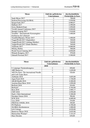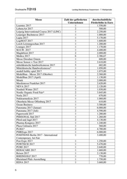 Drucksache 7/2115 Landtag Mecklenburg-Vorpommern - 7. Wahlperiode Messe Zahl der geförderten durchschnittliche Unternehmen Förderhöhe in Euro Learntec 2017 1 1.550,00 LebensArt 2017 2 500,00 Leipzig Interventional Course 2017 (LINC) 1 2.250,00 Leipziger Buchmesse 2017 1 1.000,00 Ligna 2017 1 5.170,00 LogiMAT 2017 1 1.600,00 Lorch Leistungsschau 2017 1 1.200,00 Lounges 2017 1 1.170,00 M.O.W. 2017 1 4.400,00 Magdeboot 2017 2 2.000,00 Medica 2017 6 2.386,67 Messe Dresdner Ostern 1 600,00 Messe Sensor + Test 2017 1 2.610,00 mitteldeutsche handwerksmesse 2017 5 682,00 Mitteldeutsche Handwerksmesse* 1 1.050,00 modell hobby spiel 2017 2 1.075,00 Modellbau - Messe 2017 (Oktober) 1 2.560,00 Modellbau 2017 (April) 1 1.130,00 Motek 1 2.000,00 Musikmesse Frankfurt 2017 1 2.620,00 NEVA 2017 5 2.120,00 Nordstil Winter 2017 1 1.030,00 Nordic Organic Food Fair* 2 3.845,00 Norla 2017 1 670,00 Nuklearmedizin 2017 1 1.060,00 Oberrhein Messe Offenburg 2017 1 610,00 Ocean Business 1 3.580,00 Panorama 2017 (Januar) 1 6.000,00 Panorama 2017 (Juli) 2 4.590,00 Paperworld 2017 1 1.280,00 PERSONAL Süd 2017 1 1.260,00 Pferd und Jagd 2017 2 4.130,00 Pharma-Kongress 2017 1 1.240,00 Plaza Culinaria 2017 1 560,00 PLMA* 2 4.780,00 PMRExpo 2017 1 6.000,00 POSITIONS Berlin 2017 - International 1 3.400,00 Contemporary Art Fair Post Expo 2017 1 1.250,00 POWTECH 2017 1 5.470,00 PURE 2017 1 2.640,00 REHACARE 2017 1 1.660,00 Reisen 2017 1 2.130,00 RHEINGOLF 2017 1 770,00 Rheinland Pfalz Ausstellung 1 1.750,00 RSNA 2017 1 3.660,00 6