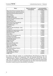 Drucksache 7/2115 Landtag Mecklenburg-Vorpommern - 7. Wahlperiode Messe Zahl der geförderten durchschnittliche Unternehmen Förderhöhe in Euro Haus Garten Freizeit (Leipziger Messe) 3 1.520,00 IAW Internationale Aktionswarenmesse 2 2.880,00 IHM Internationale Handwerksmesse 1 550,00 Imm-Cologne 1 2.100,00 Inhorgenta 2018 1 2.250,00 INTERGASTRA 2018 3 2.630,00 Internationale Spielwarenmesse 2018 1 3.060,00 Internorga 2018 3 2.940,00 Jagd und Hund 2018 1 1.080,00 Jahrestagung der Gesellschaft für 1 1.420,00 Humangentik (GfH) 2018 LOUNGES 2018 1 1.000,00 Magdeboot 1 1.700,00 Markt des guten Geschmacks - Slow 1 570,00 Food Messe mitteldeutsche handwerksmesse 2018 2 1.080,00 Modellbaumesse Wels 2018 1 1.130,00 Musikmesse 2018 1 2.350,00 Namm Show 1 2.790,00 Nordec 2018 Die Fachmesse für 1 1.020,00 Produktion im Norden Oceanology International 2018 1 5.930,00 PANORAMA Berlin 1 5.850,00 Paperworld 2018 1 1.180,00 PURE London 1 2.030,00 Reisemesse Dresden 2018 1 860,00 Reisen & Caravaning 1 810,00 Salon Automobile 2018 1 2.140,00 SMM 2018 1 2.080,00 The European Human Genetics 1 1.580,00 Conference 2018 The Village - Whiskymesse 1 500,00 TrendSet/Bijoutex Winter 1 1.440,00 WIRE 2018 1 6.000,00 Die Tabelle enthält die Angaben zur einzelbetrieblichen Messeförderung für KMU der Staatskanzlei aus Mitteln des Europäischen Fonds für Regionale Entwicklung. Die mit * gekennzeichneten Angaben sind Zuwendungen im Rahmen der Förderung des Absatzes land-, fisch- und ernährungswirtschaftlicher Erzeugnisse des Ministeriums für Landwirtschaft und Umwelt. Es handelt sich, sofern Unternehmen auf einer Messe durch beide Instrumente bezuschusst wurden, um jeweils unterschiedliche Unternehmen. 8