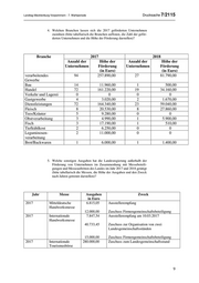 Landtag Mecklenburg-Vorpommern - 7. Wahlperiode Drucksache 7/2115 4. Welchen Branchen lassen sich die 2017 geförderten Unternehmen zuordnen (bitte tabellarisch die Branchen auflisten, die Zahl der geför- derten Unternehmen und die Höhe der Förderung darstellen)? Branche 2017 2018 Anzahl der Höhe der Anzahl der Höhe der Unternehmen Förderung Unternehmen Förderung (in Euro) (in Euro) verarbeitendes 94 257.890,00 27 81.790,00 Gewerbe Bau 14 11.960,00 1 500,00 Handel 72 161.220,00 19 34.160,00 Verkehr und Lagerei 0 0 0 0 Gastgewerbe 4 3.020,00 2 1.670,00 Dienstleistungen 72 164.340,00 23 59.040,00 Fleisch 8 20.530,00 8 27.860,00 Tees/Kräuter 5 9.280,00 0 0 Obstverarbeitung 3 4.990,00 1 5.900,00 Fisch 3 17.190,00 1 510,00 Tiefkühlkost 2 6.250,00 0 0 Leguminosen- 2 11.000,00 0 0 verarbeitung Brot/Backwaren 1 6.000,00 1 1.400,00 5. Welche sonstigen Ausgaben hat die Landesregierung außerhalb der Förderung von Unternehmen im Zusammenhang mit Messebeteili- gungen und Messeauftritten des Landes im Jahr 2017 und 2018 getätigt (bitte tabellarisch die Messen, die Höhe der Ausgaben und den Zweck nach Jahren getrennt darstellen)? Jahr Messe Ausgaben Zweck in Euro 2017 Mitteldeutsche 6.815,05 Ausstellerempfang Handwerksmesse 12.000,00 Zuschuss Firmengemeinschaftsbeteiligung 2017 Internationale 7.847,54 Ausstellerempfang am 10.03.2017 Handwerksmesse 40.733,45 Zuschuss zur Organisation von zwei Landesgemeinschaftsständen 15.000,00 Zuschuss Firmengemeinschaftsbeteiligung 2017 Internationale 280.000,00 Zuschuss zum Landesgemeinschaftsstand Tourismusbörse 9