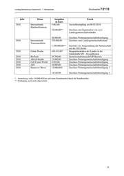 Landtag Mecklenburg-Vorpommern - 7. Wahlperiode Drucksache 7/2115 Jahr Messe Ausgaben Zweck in Euro 2018 Internationale 5.063,69 Ausstellerempfang am 08.03.2018 Handwerksmesse 52.040,00** Zuschuss zur Organisation von zwei Landesgemeinschaftsständen 20.000,00 Zuschuss Firmengemeinschaftsbeteiligung 2018 Internationale 270.000,00 Zuschuss zum Landesgemeinschaftsstand Tourismusbörse 1.350.000,00** Zuschuss zur Ausgestaltung der Partnerschaft mit der ITB Berlin 2018 Grüne Woche 610.415,84* Imagepräsentation des Landes in der Länderhalle MV - Gesamtkosten 2018 BioFach 29.700,00 Gemeinschaftsbereich/VIP-Bereich 2018 ARAB Health 15.000,00 Zuschuss Firmengemeinschaftsbeteiligung 2018 Call Center World 6.955,68 Zuschuss Firmengemeinschaftsbeteiligung 2018 AIX 10.000,00 Zuschuss Firmengemeinschaftsbeteiligung 2018 Hannover Messe 15.000,00 € Zuschuss Firmengemeinschaftsbeteiligung 1 14.520,98 Zuschuss Firmengemeinschaftsbeteiligung 2 * Anmerkung: cirka 110.000,00 Euro auf einen Einnahmetitel durch die Standbetreiber ** Festlegung, noch nicht abgerechnet 11