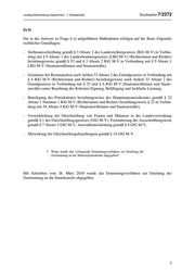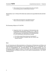 Drucksache 7/2372 Landtag Mecklenburg-Vorpommern - 7. Wahlperiode 4. Wann wurde der für das Amt ausgewählte Bewerber über das Ergebnis der Ausschreibung und des Auswahlverfahrens informiert? Mit Schreiben vom 14. Februar 2018 erhielt unter anderem der ausgewählte Bewerber die Infor- mation. 5. Wann erfolgte die Ernennung des ausgewählten Bewerbers? Wenn sie noch nicht erfolgte, was sind dafür die Gründe? Die Ernennung erfolgte am 19. Juli 2018. 6. Entsprechend Artikel 2 der Anordnung des Ministerpräsidenten über die Übertragung personalrechtlicher Befugnisse vom 17. April 2013 (GVOBl. M-V S. 273) ist die Ernennung von Richterinnen und Richtern und Staatsanwältinnen und Staatsanwälten ab der Besoldungsgruppe R3 von der Zustimmung der Ministerpräsidentin abhängig. a) Von welchen genauen Kriterien hängt diese Zustimmung ab? b) Auf welchen rechtlichen Grundlagen fußen diese Kriterien (bitte detailliert erläutern)? Zu a) Für die Zustimmung der Ministerpräsidentin zur Ernennung der Richterinnen und Richter und Staatsanwältinnen und Staatsanwälte ab der Besoldungsgruppe R3 ist es erforderlich, dass zuvor die Rechtmäßigkeit des Auswahlverfahrens, der Auswahlentscheidung und des Ernennungsverfahrens geprüft worden ist. Dazu gehört auch die Prüfung der Verwirklichung der Gleichstellung von Männern und Frauen in der Landesverwaltung gemäß § 1 des Gleich- stellungsgesetzes. 2