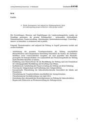 Landtag Mecklenburg-Vorpommern - 6. Wahlperiode Drucksache 6/4149 Zu b) Entfällt. 6. Welche Konsequenzen sind aufgrund des Prüfungsergebnisses durch die Landesregierung gezogen worden bzw. sollen gezogen werden? Die Feststellungen, Hinweise und Empfehlungen des Landesrechnungshofes wurden zur Grundlage genommen, die gesamte Stiftungsarbeit - insbesondere Arbeitsabläufe, Dokumentationen, Finanzverwaltung, Abrechnungen, Kommunikationsstränge, Controlling - intensiv zu betrachten, zu diskutieren und zu prüfen. Folgende Themenkomplexe sind aufgrund der Prüfung in Angriff genommen worden und werden bearbeitet: - Aufarbeitung der gesamten Vermögenssituation der Stiftung einschließlich übersichtlicherer und transparenterer Darstellung hinsichtlich der Konten, der Darlehens- rückflüsse sowie voraussichtlichen Ausgaben, um auch gegenüber dem Haushalts- gesetzgeber bei Inanspruchnahme von Landesmitteln den Finanzierungsbedarf der Stiftung nachvollziehbar darstellen zu können, - Einführung einer Datensoftware für die Buchführung der Stiftung nach den Grundsätzen der ordnungsgemäßen Buchführung und Erstellung einer Bilanz, - buchhalterische Aufarbeitung der Finanzverwaltung der Stiftung seit deren Gründung, - Fixierung der Anlagestrategie und Erarbeitung einer Anlagerichtlinie, - konzeptionelle Überarbeitung der Jahresabschlussberichte hinsichtlich der Inhalte und Präsentation, - Überarbeitung der Vergaberichtlinien einschließlich der Antragsformulare, - Überarbeitung der Geschäftsordnung vom April 2014, - Einrichtung eines ehrenamtlichen Kontrollgremiums zur Prüfung der Jahresabschlüsse, - Beginn einer Diskussion zur Weiterentwicklung des Stiftungszwecks. 3