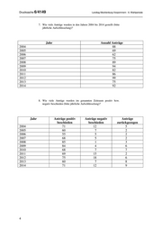 Drucksache 6/4149 Landtag Mecklenburg-Vorpommern - 6. Wahlperiode 7. Wie viele Anträge wurden in den Jahren 2004 bis 2014 gestellt (bitte jährliche Aufschlüsselung)? Jahr Anzahl Anträge 2004 88 2005 69 2006 62 2007 75 2008 89 2009 94 2010 82 2011 86 2012 99 2013 75 2014 92 8. Wie viele Anträge wurden im genannten Zeitraum positiv bzw. negativ beschieden (bitte jährliche Aufschlüsselung)? Jahr Anträge positiv Anträge negativ Anträge beschieden beschieden zurückgezogen 2004 71 12 5 2005 60 7 2 2006 55 5 2 2007 68 5 2 2008 85 1 3 2009 84 4 6 2010 68 7 7 2011 69 15 2 2012 75 18 6 2013 60 7 8 2014 71 12 9 4
