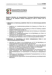 Landtag Mecklenburg-Vorpommern - 6. Wahlperiode Drucksache 6/3305 Anlage Sämtliche Aktivitäten der Kassenärztlichen Vereinigung Mecklenburg-Vorpommern (KVMV), um die ambulante ärztliche Versorgung im Land zu sichern und zu verbessern: 1. Maßnahmen zur Gewinnung zusätzlicher Ärzte für von Unterversorgung bedrohte Gebiete Gewährung von Investitionskostenzuschüssen bei Zulassung von Ärzten (bis zu 50.000 Euro) Gewährung von Zuschüssen für die Anstellung von Ärzten bei Schaffung zusätzlich besetzter Arztstellen (bis zu 20.000,- €) Gewährung von Investitionskostenzuschüssen bei der Gründung von Außenstellen/ Zweigpraxen (bis zu 15.000,- €) Gewährung von Gehaltskostenzuschüssen für die Beschäftigung von Ärzten zur Vorbereitung auf die Praxisübernahme Übernahme von Umzugskosten (z.B. bei Rückkehr von Ärzten aus dem Ausland oder bei Verlegung des Praxissitzes in einen von Unterversorgung bedrohten Bereich) 2. Maßnahmen zur Unterstützung von bereits niedergelassenen Ärzten in von Unterversorgung bedrohten Gebieten Übernahme von Kosten für die Kinderbetreuung und für die Beschäftigung von Entlastungsassistenten bei Erziehungszeiten oder Erkrankung Zusatzzahlung bei Praxisausfall durch Mutterschaft (50,- € pro Tag nach der Entbindung für insgesamt 8 Wochen) für alle Ärztinnen und Psychotherapeutinnen auch in den nicht von Unterversorgung bedrohten Gebieten und Fachgruppen Gewährung von fallzahlabhängigen Erschwerniszuschlägen Neugestaltung des Bereitschaftsdienstes (Sicherstellung zu den sprechstundenfreien Zeiten) einschließlich einer Bereitschaftspauschale und der Einrichtung von Bereitschaftsdienstpraxen an Krankenhäusern zur Entlastung der niedergelassenen Ärzte Genehmigung der Beschäftigung arztentlastender Praxisassistentinnen (zur Zeit ca. 150 in Mecklenburg-Vorpommern) Gewährleistung einer angemessenen Honorierung/Aussetzung honorarbegrenzender Maßnahmen 5