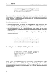 Drucksache 6/3199 Landtag Mecklenburg-Vorpommern - 6. Wahlperiode Schulart/ Jahr- Lehrer- Lehrer- zugrunde Lehrer- Lehrer- Rechts- Bildungsgang gangs- wochen- wochen- gelegte stunden stunden grundlage stufe stunden je stunden je Schüler- je Woche, je Woche, Schülerin/ Schülerin/ anzahl Theorie Fachpraxis Schüler, Schüler, Theorie Fachpraxis Orthoptistin/ 1 bis 3 1,007 3,315 12 12,1 39,8 Orthoptist Logopädin/ 1 bis 3 1,069 2,519 12 12,8 30,2 Logopäde Altenpflegerin/ 1 bis 3 0,639 0,475 24 15,3 11,4 Altenpfleger Pharmazeutisch- 1 bis 2 0,740 1,591 24 17,8 38,2 technische Assisten- tin/Pharmazeutisch- technischer Assistent Medizinische 1 bis 3 0,559 0,628 24 13,4 15,1 Dokumentarin/ Medizinischer Dokumentar Familienpflegerin/ 1 bis 3 0,701 0,433 24 16,8 10,4 Familienpflegerin Sozialassistentin/ 1 und 2 1,346 0 24 32,3 0 Sozialassistenz- Sozialassistent Höhere Berufs- fachschulver- ordnung Fachgymnasien (FGy) Fachgymna- alle Fachrichtungen 1 bis 3 1,551 0 24,5 38,0 0 siumsverord- bzw. 4 0 nung Fachoberschule (FOS) Fachoberschul- alle Fachrichtungen 1 1,462 0 26 38,0 0 verordnung Fachschule (FS) Fachschul- Technik, Wirtschaft 1 und 2 1,500 0 24 36,0 0 verordnung Teilzeit (berufs- 3 und 4 0,708 0 24 17,0 0 begleitend, 4 Jahre) Teilzeit (berufs- 1 bis 3 0,944 0 24 23,0 0 begleitend, 3 Jahre) Erzieherin/Erzieher 1 und 2 1,346 0 24 32,3 0 Fachschul- Teilzeit (Schuljahr 1 bis 3 0,700 0 24 16,8 0 verordnung 2014/2015) Sozialwesen 4 0,500 0 24 12,0 0 Teilzeit (Schuljahr 1 bis 4 0,700 0 24 16,8 0 2015/2016) Heilerziehungs- 1 und 2 1,346 0 24 32,3 0 pflegerin/Heil- erziehungspfleger Teilzeit (Schuljahr 1 bis 3 0,700 0 24 16,8 0 2014/2015) 4 0,500 0 24 12,0 0 Teilzeit (Schuljahr 1 bis 4 0,700 0 24 16,8 0 2015/2016) 6
