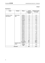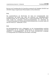 Landtag Mecklenburg-Vorpommern - 6. Wahlperiode Drucksache 6/3199 Bei den in der Verordnung über die Unterrichtsversorgung für die Schuljahre 2014/2015 und 2015/2016 Anlage 4 ausgewiesenen Werten handelt es sich um Richtwerte. Zu a) Für Landesfachklassen der Berufsschule, bei denen die Lerngruppengröße unter 22 Schülerinnen und Schüler liegt, ergibt sich rechnerisch eine lerngruppenbezogene Stundenausstattung, die bei wöchentlich unter 13 Lehrerwochenstunden liegt. Die rechne- rische Anzahl des zusätzlichen Lehrerwochenstundenbedarfs, um wöchentlich die 13 Lehrerwochenstunden zur Absicherung des Berufsschulunterrichts zu erreichen, ergibt sich nach der Formel [(22 - Schülerzahl) x 0,591]. Zu b) Für Berufsgruppenklassen sind in Abhängigkeit von der Lerngruppenbildung zusätzliche Teilungsstunden für die notwendige Differenzierung im berufsspezifischen Unterricht erforderlich. Je Berufsgruppenklasse sind für die zweite berufsspezifische Lerngruppe 2,5 Teilungsstunden für elf Schülerinnen und Schüler veranschlagt. 3