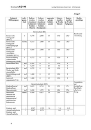 Drucksache 6/3199 Landtag Mecklenburg-Vorpommern - 6. Wahlperiode 2. Welche sicherzustellenden Unterrichtsumfänge sind in den einzelnen Schularten bzw. Bildungsgängen verbindlich vorgegeben (bitte in der Struktur wie in der Anlage 3 mit Angabe der jeweiligen Rechtsgrund- lage und jeweiligem Stundenumfang angeben)? Die sicherzustellenden Unterrichtsumfänge sind für den theoretischen Unterricht in der Spalte 6 und für den fachpraktischen Unterricht in Spalte 7 der Anlage 1 in Lehrerstunden je Woche angegeben (Gesamtstundenanzahl dividiert durch die Anzahl der Ausbildungsjahre und 40 Wochen je Ausbildungsjahr). In den Unterrichtsumfängen sind auch enthalten: - die Teilungsstundenanteile, zum Beispiel eine Stunde je Woche für die Berufsschule, drei Stunden je Woche für das Fachgymnasium und die Fachoberschule, Teilung im fachprak- tischen Unterricht der Höheren Berufsfachschule, - die Lehrerstundenanteile für die Praktikumsbetreuung, zum Beispiel für die Höhere Berufsfachschule der Gesundheitsfachberufe und der Sozialassistenz und der Fachschule für Sozialwesen, - die Lehrerstundenanteile für die mündlichen und praktischen Prüfungen in den Gesundheitsfachberufen. 3. Welche Klassen sind im Schuljahr 2013/2014 an den öffentlichen beruflichen Schulen des Landes Mecklenburg-Vorpommern gebildet worden (bitte zum Stichtag der amtlichen Schulstatistik und in der Struktur der Anlage 3 mit jeweiliger Schülerzahl und jeweils zugewie- sener Stundenanzahl und nach beruflichen Schulen getrennt angeben)? In der Anlage 2 sind die im Schuljahr 2013/2014 gebildeten Klassen angegeben. 4. Auf welcher Grundlage ist die in der Anlage 4 der „Verordnung über die Unterrichtsversorgung für die Schuljahre 2014/2015 und 2015/2016“ enthaltene Bemessung des Zusatzbedarfes a) für Landesfachklassen und b) für Berufsgruppenklassen ermittelt worden? Die im Rahmen des Zusatzbedarfes zusätzlich bereitgestellten Lehrerwochenstunden werden den beruflichen Schulen im erforderlichen Umfang unter Berücksichtigung der Anzahl der Schülerinnen und Schüler in den Landesfach- und Berufsgruppenklassen sowie der Anzahl der Schülerinnen und Schüler im Zusatzunterricht für den Erwerb der Fachhochschulreife zur Verfügung gestellt. 2