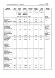 Landtag Mecklenburg-Vorpommern - 6. Wahlperiode Drucksache 6/3199 Schulart/ Jahr- Lehrer- Lehrer- zugrunde Lehrer- Lehrer- Rechts- Bildungsgang gangs- wochen- wochen- gelegte stunden stunden grundlage stufe stunden je stunden je Schüler- je Woche, je Woche, Schülerin/ Schülerin/ anzahl Theorie Fachpraxis Schüler, Schüler, Theorie Fachpraxis Höhere Berufsfachschule (HBFS) Höhere Wirtschaft 1 und 2 1,167 0,417 24 28,0 10,0 Berufsfach- (kaufmännische schulverord- 3 0,042 0 24 1,0 0 Assistenz) nung Gewerbe (technische 1 und 2 0,958 0,833 24 23,0 20,0 Assistenz und 3 0,042 0 24 1,0 0 Kosmetik) Gesundheits- und 1 bis 3 0,639 0,486 24 15,3 11,7 Gesundheits- Krankenpflege- und Sozial- rin/Gesundheits- pflege- und Krankenpfleger Berufsfach- Gesundheits- und 1 bis 3 0,639 0,486 24 15,3 11,7 schulverord- Kinderkrankenpfle- nung in gerin/Gesundheits- Verbindung und Kinderkranken- mit den pfleger bundesrecht- Hebamme 1 bis 3 0,662 1,302 17 11,3 22,1 lichen Physiotherapeutin/ 1 bis 3 0,712 1,012 24 17,1 24,3 Ausbildungs- Physiotherapeut und Prüfungs- Medizinisch- 1 bis 3 0,576 1,384 24 13,8 33,2 ordnungen technische Laboratoriums- assistentin/ Medizinisch- technischer Laboratoriums- assistent Medizinisch- 1 bis 3 0,833 1,278 17 14,2 21,7 technische Assistentin für Funktionsdiagnostik/ Medizinisch- technischer Assistent für Funktions- diagnostik Medizinisch- 1 bis 3 0,557 1,410 24 13,4 33,8 technische Radiolo- gieassistentin/ Medizinisch- technischer Radiolo- gieassistent Diätassistentin/ 1 bis 3 0,715 1,004 24 17,2 24,1 Diätassistent Ergotherapeutin/ 1 bis 3 0,679 0,921 24 16,3 22,1 Ergotherapeut 5