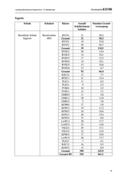 Landtag Mecklenburg-Vorpommern - 6. Wahlperiode Drucksache 6/3199 Eggesin Schule Schulart Klasse Anzahl Stunden Grund- Schülerinnen/ versorgung Schüler Berufliche Schule Berufsschule BVJ31 21 58,3 Eggesin (BS) Gesamt 21 58,3 BVS21 19 53,8 BVS31 20 56,7 Gesamt 39 110,5 BVB31 20 14,4 BVB32 14 10,1 BVB33 17 12,3 BVB34 14 10,1 BVB35 15 10,8 BVB36 12 8,7 Gesamt 92 66,4 BÄC21 13 7,7 BÜK11 21 12,4 FLE11 11 6,5 FLE21 9 5,3 FVB01 10 3,5 FVB11 12 7,1 GME01 11 3,8 GME11 20 11,8 GME21 5 3,0 KFM01 17 5,9 KFM11 19 11,2 KFM21 18 10,6 KON11 26 15,4 KON21 15 8,9 LAW11 30 17,7 LAW21 25 14,8 VKÄ21 29 17,1 VKÄ31 22 13,0 KFM31 17 10,0 LAW31 30 17,7 FLE31 7 4,1 BÄC31 16 9,5 KON31 15 8,9 Gesamt 398 225,9 Gesamt BS 550 461,1 9