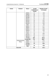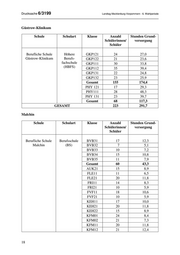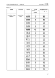 Drucksache 6/3199 Landtag Mecklenburg-Vorpommern - 6. Wahlperiode Güstrow-Klinikum Schule Schulart Klasse Anzahl Stunden Grund- Schülerinnen/ versorgung Schüler Berufliche Schule Höhere GKP121 24 27,0 Güstrow-Klinikum Berufs- GKP122 21 23,6 fachschule GKP111 30 33,8 (HBFS) GKP112 35 39,4 GKP131 22 24,8 GKP132 23 25,9 Gesamt 155 174,4 PHY 121 17 29,3 PHY111 28 48,3 PHY 131 23 39,7 Gesamt 68 117,3 GESAMT 223 291,7 Malchin Schule Schulart Klasse Anzahl Stunden Grund- Schülerinnen/ versorgung Schüler Berufliche Schule Berufsschule BVB31 17 12,3 Malchin (BS) BVB32 7 5,1 BVB33 10 7,2 BVB34 15 10,8 BVB35 11 7,9 Gesamt 60 43,3 AUK21 15 8,9 FLE11 11 6,5 FLE21 20 11,8 FRI11 14 8,3 FRI21 10 5,9 FVF11 18 10,6 FVF21 10 5,9 KEH11 17 10,0 KEH21 20 11,8 KEH22 15 8,9 KFM01 24 8,4 KFM02 21 7,3 KFM11 20 11,8 KFM12 21 12,4 18