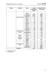 Landtag Mecklenburg-Vorpommern - 6. Wahlperiode Drucksache 6/3199 Schule Schulart Klasse Anzahl Stunden Grund- Schülerinnen/ versorgung Schüler BKF23 17 10,0 Gesamt 1.391 795,6 Gesamt BS 1.525 940,1 Fachschule (FS) ERZ11* 25 25,5 ERZ12 21 10,5 ERZ21 18 23,1 ERZ31 28 35,9 Gesamt 92 95,0 HEP11* 23 23,5 HEP21 15 19,2 HEP31 20 25,6 Gesamt 58 68,3 Gesamt FS 150 163,3 Fachoberschule FOW31 11 16,1 (FOS) Gesamt FOS 11 16,1 SOA21 25 33,6 Höhere SOA22 25 33,6 Berufs- SOA31 28 37,7 fachschule SOA32 28 37,7 (HBFS) Gesamt 106 142,7 HBFS FGS11 19 29,5 FGS21 26 40,3 Fachgymnasium FGS31 25 38,8 (FGy) Gesamt 70 108,6 Gesamt FGy 70 108,6 GESAMT 1.862 1.370,8 * auslaufend alter Faktor ** berufsbegleitend 17