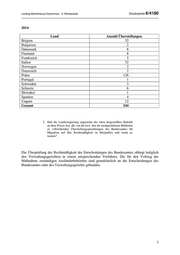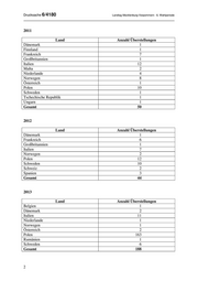Drucksache 6/4180 Landtag Mecklenburg-Vorpommern - 6. Wahlperiode 2011 Land Anzahl Überstellungen Dänemark 1 Finnland 1 Frankreich 7 Großbritannien 1 Italien 12 Malta 2 Niederlande 4 Norwegen 8 Österreich 1 Polen 10 Schweden 1 Tschechische Republik 1 Ungarn 1 Gesamt 50 2012 Land Anzahl Überstellungen Dänemark 1 Frankreich 6 Großbritannien 1 Italien 7 Norwegen 2 Polen 12 Schweden 10 Schweiz 2 Spanien 3 Gesamt 44 2013 Land Anzahl Überstellungen Belgien 1 Dänemark 2 Italien 11 Niederlande 1 Norwegen 1 Österreich 2 Polen 163 Rumänien 1 Schweden 6 Gesamt 188 2