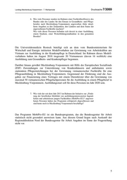 Landtag Mecklenburg-Vorpommern - 7. Wahlperiode Drucksache 7/3069 6. Wie viele Personen wurden im Rahmen einer Fachkräfteoffensive des Bundes oder des Landes für den Einsatz in Gesundheits- und Pflege- berufen nach Mecklenburg-Vorpommern angeworben (bitte detail- lierte Angaben zu den Zeitpunkten, den Ländern und dem Status der angeworbenen Fachkräfte machen)? Wie viele dieser Personen befinden sich derzeit in einer Ausbildung, einem Studium, einer Weiterbildungsmaßnahme in den genannten Berufen? Die Universitätsmedizin Rostock beteiligt sich an dem vom Bundesministerium für Wirtschaft und Energie initiierten Modellvorhaben zur Gewinnung von Arbeitskräften aus Vietnam zur Ausbildung in der Krankenpflege in Deutschland. Im Rahmen dieses Modell- vorhabens haben im August 2018 insgesamt 20 Vietnamesen (davon 16 weiblich) eine Ausbildung zum Gesundheits- und Krankenpfleger begonnen. Darüber hinaus gewährt Mecklenburg-Vorpommern mit Hilfe des Europäischen Sozialfonds (ESF) Zuwendungen zur Unterstützung von Krankenhäusern und ambulanten sowie stationären Pflegeeinrichtungen bei der Gewinnung vietnamesischer Fachkräfte für eine Pflegeausbildung in Mecklenburg-Vorpommern. Gegenstand der Förderung sind die Aus- gaben zur Finanzierung eines Vertrages mit einem Dienstleister über die Gewinnung von maximal 50 vietnamesischen Pflegefachpersonen für die Ausbildung in einem Pflegeberuf in Mecklenburg-Vorpommern. Ausbildungsstart soll für diese Personen im Jahr 2020 sein. 7. Wie viele der seit dem Jahr 2013 im Rahmen der Initiative zur „Förde- rung der beruflichen Mobilität von ausbildungsinteressierten Jugend- lichen und arbeitslosen jungen Fachkräften (MobiPro-EU)“ angewor- benen Personen haben das Programm erfolgreich abgeschlossen und sind heute noch in Mecklenburg-Vorpommern beschäftigt? Das Programm MobiPro-EU ist ein Bundesprogramm, das die Bundesagentur für Arbeit statistisch nicht gesondert ausweisen kann. Aus diesem Grund liegen nach Auskunft der Regionaldirektion Nord der Bundesagentur für Arbeit Angaben im Sinne der Fragestellung nicht vor. 5