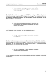 Landtag Mecklenburg-Vorpommern - 6. Wahlperiode Drucksache 6/5880 4. Welche polizeilichen und sonstigen Erkenntnisse werden zur Über- prüfung der Zuverlässigkeit und Geeignetheit von Ordnerinnen und Ordnern herangezogen? Gemäß § 18 Absatz 2 Versammlungsgesetz bedarf die Verwendung von Ordnern der polizei- lichen Genehmigung. Die polizeiliche Prüfung der Zuverlässigkeit und Geeignetheit wird auf der Grundlage vorhandener Erkenntnisse über die gemeldeten Personen durchgeführt. Auf die Antwort zu Frage 2 wird verwiesen. 5. Welche polizeilichen Datenbanken werden bei der Entscheidung über die Zuverlässigkeit und Geeignetheit von Ordnerinnen und Ordnern konsultiert bzw. verwendet? Die Überprüfung erfolgt regelmäßig über die Verbunddatei INPOL. 6. Wie lange werden personenbezogene Daten in diesen Datenbanken jeweils gespeichert? Die Dauer der Speicherung personenbezogener Daten richtet sich gemäß § 46 des Sicherheits- und Ordnungsgesetzes und der einschlägigen Vorschriften des Gesetzes über das Bundes- kriminalamt und die Zusammenarbeit des Bundes und der Länder in kriminalpolizeilichen Angelegenheiten nach dem Anlass der Speicherung. 7. Wie wird die Richtigkeit der in diesen Datenbanken gespeicherten personenbezogenen Daten sichergestellt? Für die Richtigkeit der Eingabe der personenbezogenen Daten ist die eingebende Dienststelle verantwortlich. 3