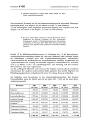 Drucksache 6/1013 Landtag Mecklenburg-Vorpommern - 6. Wahlperiode 4. Jährliche Mehrkosten in welcher Höhe werden infolge des BVG- Urteils voraussichtlich entstehen? Eine zuverlässige Schätzung für die vom Bundesverfassungsgericht angeordnete Übergangs- regelung ist derzeit nicht möglich. Auf die Antwort zu Frage 3 a) wird verwiesen. Zu den Mehrausgaben einer endgültigen gesetzlichen Regelung sind Angaben noch nicht möglich. Auf die Antwort zu den Fragen 2, 2 a) und 2 b) wird verwiesen. 5. Kosten in welcher Höhe erstattete das Land den Kommunen und den Landkreisen für erbrachte Leistungen aus dem Asylbewerber- leistungsgesetz gemäß § 5 Flüchtlingsaufnahmegesetz Mecklenburg- Vorpommern in den Jahren 2007, 2008, 2009, 2010 und 2011 (bitte jahrweise sowie gegliedert nach Landkreisen und kreisfreien Städten angeben)? Gemäß § 5 des Flüchtlingsaufnahmegesetzes in Verbindung mit § 5 der Zuwanderungs- zuständigkeitslandesverordnung erstattet das Land den Landkreisen und kreisfreien Städten die notwendigen Leistungen nach dem Asylbewerberleistungsgesetz (einschließlich Unterkunftskosten) für Asylbewerber und Asylbewerberinnen, ehemalige Asylbewerber und Asylbewerberinnen mit Duldung und unerlaubt eingereiste Ausländerinnen und Ausländer nach § 15a Absatz 1 Satz 1 des Aufenthaltsgesetzes. Eine Trennung nach den einzelnen Personenkreisen wird nicht vorgenommen. Auf die nachfolgende Übersicht wird verwiesen. Die Angaben basieren auf den monatlichen Abrechnungen der Landkreise und kreisfreien Städte gegenüber dem Amt für Migration und Flüchtlingsangelegenheiten im Landesamt für innere Verwaltung für das jeweilige Jahr. Sie beinhalten auch Investitionen in den Gemeinschaftsunterkünften. Zur besseren Übersichtlichkeit wurde die Tabelle auch für die Jahre 2007 - 2010 auf die neuen Kreis- strukturen umgestellt. Kommune 2007 2008 2009 2010 2011 (in Euro) (in Euro) (in Euro) (in Euro) (in Euro) Schwerin 549.891 537.937 340.081 262.363 203.699 Hansestadt Rostock 2.136.670 1.678.822 1.446.692 1.743.556 2.050.480 Ludwigslust-Parchim 2.795.464 2.319.861 2.037.650 1.761.849 2.418.622 Landkreis Rostock 2.865.647 1.927.303 1.585.814 1.591.414 1.435.637 Mecklenburgische 4.601.786 4.002.582 3.850.661 3.671.381 3.387.915 Seenplatte Nordwestmecklenburg 934.436 650.823 695.905 904.512 1.285.241 Vorpommern-Greifswald 2.661.373 1.832.689 574.120 491.876 1.555.121 Vorpommern-Rügen 1.411.434 950.257 884.360 936.773 896.685 17.956.701 13.900.274 11.415.283 11.363.724 13.233.400 4