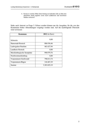 Landtag Mecklenburg-Vorpommern - 6. Wahlperiode Drucksache 6/1013 6. Kosten in welcher Höhe fielen bislang im laufenden Jahr an (bitte den aktuellsten Stand angeben sowie nach Landkreisen und kreisfreien Städten sortieren)? Siehe auch Antwort zu Frage 5. Erfasst werden können nur die Ausgaben, für die von den Kommunen bisher Abrechnungen vorgelegt worden sind. Auf die nachfolgende Übersicht wird verwiesen: Kommune 2012 (in Euro) 0,00 Schwerin Hansestadt Rostock 886.936,46 Ludwigslust-Parchim 463.427,94 Landkreis Rostock 0,00 Mecklenburgische Seenplatte 990.979,76 Nordwestmecklenburg 0,00 Vorpommern-Greifswald 798.013,74 Vorpommern-Rügen 144.467,29 Summe 3.283.825,19 5