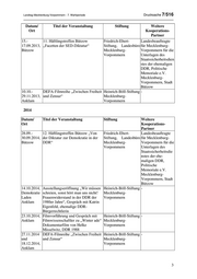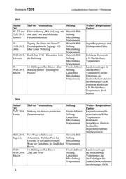 Drucksache 7/516 Landtag Mecklenburg-Vorpommern - 7. Wahlperiode 2015 Datum/ Titel der Veranstaltung Stiftung Weitere Kooperations- Ort Partner 20., 23. und Filmvorführung „Wir sind jung, wir Heinrich-Böll- - 27.01.2015, sind stark“ mit anschließender Stiftung Rostock Podiumsdiskussion Mecklenburg- Vorpommern 10.- Tagung „Im Osten viel Neues?“ Heinrich-Böll- Jugendbegegnungs- und 11.04.2015, Deutsch-polnische Tagung - 100 Stiftung Bildungsstätte Golm Golm Jahre Erster Weltkrieg Mecklenburg- Vorpommern 09.05.2015, Der 8. Mai 1945 - Die andere Seite Heinrich-Böll- Politische Memoriale Schwerin der Befreiung Stiftung e.V. Mecklenburg- Mecklenburg- Vorpommern Vorpommern 27.- 13. Häftlingstreffen Bützow „Die Friedrich-Ebert- Landesbeauftragte für 29.09.2015, deutsche Einheit - Ein längerer Stiftung, Mecklenburg- Bützow Prozess“ Landesbüro Vorpommern für die Mecklenburg- Unterlagen des Vorpommern Staatssicherheitsdienstes der ehemaligen DDR, Politische Memoriale e.V. Mecklenburg- Vorpommern, Stadt Bützow 2016 Datum/ Titel der Veranstaltung Stiftung Weitere Kooperations- Ort Partner 27.02.2016, Stärkung der deutsch-polnischen Friedrich-Ebert- Regionalzentrum für Ramin Zusammenarbeit Stiftung, demokratische Kultur Landesbüro Vorpommern- Mecklenburg- Greifswald, Vorpommern perspektywa, Dietrich- Bonhoeffer- Begegnungszentrum Stettin/Szczecin 08.06.2016, Von Wegwerfkühen und Heinrich-Böll- - Bugewitz Ackergiften. Welchen Preis hat Stiftung Effizienz in der Landwirtschaft? Mecklenburg- Wege zur Gestaltung des ländlichen Vorpommern Raums 07.09.- 14. Häftlingstreffen Bützow Friedrich-Ebert- Landesbeauftragte 09.09.2016, „Das Jahr 1956“ Stiftung, für Mecklenburg- Bützow Landesbüro Vorpommern für Mecklenburg- die Unterlagen des Vorpommern Staatssicherheitsdienstes der ehemaligen DDR, 4