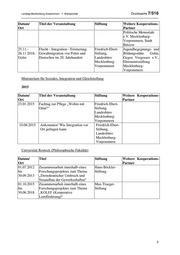 Landtag Mecklenburg-Vorpommern - 7. Wahlperiode Drucksache 7/516 Datum/ Titel der Veranstaltung Stiftung Weitere Kooperations- Ort Partner Politische Memoriale e.V. Mecklenburg- Vorpommern, Stadt Bützow 25.11.- Flucht - Integration - Erinnerung. Friedrich-Ebert- Jugendbegegnungs- und 26.11.2016, Gewaltmigration von Polen und Stiftung, Bildungsstätte Golm, Golm Deutschen im 20. Jahrhundert Landesbüro Gegen Vergessen e.V., Mecklenburg- Ehrenamtsstiftung Vorpommern Mecklenburg- Vorpommern Ministerium für Soziales, Integration und Gleichstellung 2015 Datum/ Titel der Veranstaltung Stiftung Weitere Kooperations- Ort Partner 23.01.2015 Fachtag zur Pflege „Wohin mit Friedrich-Ebert- Oma?“ Stiftung, Landesbüro Mecklenburg- Vorpommern 10.06.2015 Ankommen! Wie Integration vor Friedrich-Ebert- Ort gelingen kann. Stiftung, Landesbüro Mecklenburg- Vorpommern Universität Rostock (Philosophische Fakultät) Datum/ Titel Stiftung Weitere Kooperations- Ort Partner 01.07.2012 Zusammenarbeit innerhalb eines Hans-Böckler- bis Forschungsprojektes zum Thema Stiftung 30.09.2013 „Demokratischer Umbruch und Neuaufbau der Gewerkschaften“ 01.10.2015 Zusammenarbeit innerhalb eines Max-Traeger- bis Forschungsprojektes zum Thema Stiftung 30.06.2018 „KOLEF (Kooperative Lernförderung)“ 5
