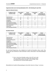 LANDTAG MECKLENBURG-VORPOMMERN Drucksache 6/5451 6. Wahlperiode 15.06.2016 KLEINE ANFRAGE der Abgeordneten Karen Stramm und Simone Oldenburg, Fraktion DIE LINKE Hygienekontrollen an den öffentlichen allgemein bildenden und beruflichen Schulen des Landes Mecklenburg-Vorpommern und ANTWORT der Landesregierung Die gefragten Daten lagen der Landesregierung nicht vor. Für die Beantwortung der Kleinen Anfrage wurde daher eine Befragung der Gesundheitsämter des Landes Mecklenburg- Vorpommern vorgenommen. 1. An wie vielen öffentlichen allgemein bildenden und beruflichen Schulen des Landes wurden im Jahr 2015 und im Jahr 2016 zum Stichtag 30. April 2016 Hygienekontrollen durch die Gesundheits- ämter der jeweiligen Kreise und kreisfreien Städte durchgeführt (bitte getrennt nach Jahren, Schularten und Kreisen bzw. kreisfreien Städten angeben)? In den nachfolgenden Tabellen ist die Anzahl der durchgeführten Hygienekontrollen an öffentlichen allgemein bildenden und beruflichen Schulen des Landes Mecklenburg- Vorpommern für den gefragten Zeitraum nach Landkreisen (LK) und kreisfreien Städten, Jahren und Schulart dargestellt. Außerdem ist dargestellt, bei wie vielen dieser Kontrollen Mängel beziehungsweise Verstöße festgestellt wurden. Die Ministerin für Arbeit, Gleichstellung und Soziales hat namens der Landesregierung die Kleine Anfrage mit Schreiben vom 13. Juni 2016 beantwortet.