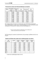 Drucksache 6/1586 Landtag Mecklenburg-Vorpommern - 6. Wahlperiode Personal des Landes nach Dienstverhältnissen und Jahren Jahr am Beschäftigte Beamte und Anteil Arbeitnehmer Anteil 30.06. gesamt Richter Anzahl Anzahl in Prozent Anzahl in Prozent 2002 54 306 15 342 28,3 38 964 71,7 2003 53 202 15 353 28,9 37 849 71,1 2004 49 712 15 065 30,3 34 647 69,7 2005 48 666 15 217 31,3 33 449 68,7 2006 43 666 14 406 33,0 29 260 67,0 2007 42 989 14 313 33,3 28 676 66,7 2008 41 714 14 059 33,7 27 655 66,3 2009 40 388 13 949 34,5 26 439 65,5 2010 40 044 13 943 34,8 26 101 65,2 2011 38 768 13 913 35,9 24 855 64,1 Die Angaben beruhen auf Analysen des Statistischen Amtes Mecklenburg-Vorpommern. Diese Zahlfallangaben weichen wegen Teilzeitbeschäftigung von den Stellenzahlen gemäß Stellenplan ab. Für das Jahr 2012 liegen noch keine Statistikangaben vor. 2. Wie hat sich die Anzahl der Landesbeamten in den jeweiligen Lauf- bahnen in den Jahren 2012 bis 2012 entwickelt? Die Entwicklung der Anzahl der Landesbeamten in den jeweiligen Laufbahnen stellt sich wie folgt dar: Beamte und Richter des Landes nach Laufbahngruppen und Jahren Jahr Anzahl höherer gehobener mittlerer einfacher am 30. 06. Dienst Dienst Dienst Dienst 2002 15 342 3 204 5 310 6 712 116 2003 15 353 3 120 5 480 6 639 114 2004 15 065 2 948 5 537 6 468 112 2005 15 217 3 065 5 640 6 389 123 2006 14 406 2 656 5 399 6 230 121 2007 14 313 2 614 5 449 6 129 121 2008 14 059 2 577 5 195 6 168 119 2009 13 949 2 520 5 315 5 997 117 1) 2010 13 943 1) 2011 13 913 1) Ausweis nach Laufbahngruppen erfolgt nicht mehr 2