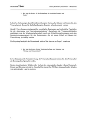 Drucksache 7/840 Landtag Mecklenburg-Vorpommern - 7. Wahlperiode 8. Wer trägt die Kosten für die Behandlung der verletzten Beamten und Hunde? Sofern bei Verletzungen durch Fremdeinwirkung der Verursacher bekannt ist, können bei dem Verursacher die Kosten für die Behandlung des Beamten geltend gemacht werden. Gemäß „Verwaltungsvereinbarung über vereinfachte Regelungen und einheitliche Pauschalen für die Abrechnung von Unterstützungseinsätzen“ übernehmen die Vertragsschließenden unabhängig von der Schadensurheberschaft jeweils die Unfallfürsorgeleistungen nach dem Beamtenversorgungsgesetz für ihre Bediensteten, die bei einem Unfall im Rahmen der Unterstützung geschädigt wurden. Zur Regelung bezüglich der Diensthunde wird auf die Antwort zu Frage 9 verwiesen. 9. Wer trägt die Kosten für die Wiederbeschaffung oder Reparatur von Führungs- und Einsatzmitteln? Ist bei Schäden durch Fremdeinwirkung der Verursacher bekannt, können bei dem Verursacher die Kosten geltend gemacht werden. Kosten einsatzbedingter Schäden oder Verluste des entsendenden Landes während Anmarsch, Einsatz und Rückmarsch sind im Einzelfall bei einem über 500 Euro hinausgehenden Schaden vom anfordernden Land zu ersetzen. 4
