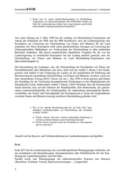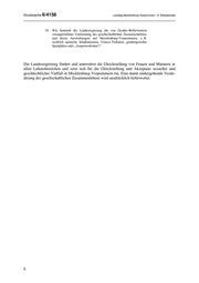 Drucksache 6/4156 Landtag Mecklenburg-Vorpommern - 6. Wahlperiode 2. Wann und wo wurde Gender-Mainstreaming (in Mecklenburg- Vorpommern zur Querschnittsaufgabe aller Politikfelder erklärt) aus Sicht der Landesregierung infolge einer ausgewogenen gesellschaft- lichen Debatte erstmalig demokratisch legitimiert? Auf seiner Sitzung am 3. März 1999 hat der Landtag von Mecklenburg-Vorpommern auf Antrag der Fraktionen der PDS und der SPD beschlossen, dass die Landesregierung eine Konzeption zur Umsetzung der Gleichstellung von Frauen und Männern für das Land erarbeiten soll. Diese Konzeption sollte neben grundsätzlichen Aussagen zur Umsetzung der Chancengleichheit Maßnahmen zur Verbesserung der Gleichstellung in allen politischen Bereichen beinhalten. Mit diesen ausdrücklichen inhaltlichen Vorgaben für die von der Landesregierung zu erstellenden Konzeption hat der Landtag deutlich gemacht, dass die Gleichstellung von Frauen und Männern im Land Mecklenburg-Vorpommern eine Querschnittsaufgabe ist. Die Entscheidung des Landtages, dass die Gleichstellung der Geschlechter ein Thema der Geschäftsbereiche aller Ministerien sein muss, leitet sich aus Artikel 3 Absatz 2 des Grund- gesetzes und Artikel 13 der Verfassung des Landes ab, die ausdrücklich die Förderung und Durchsetzung der tatsächlichen Gleichstellung von Frauen und Männern vorsehen, sowie aus dem Amsterdamer Vertrag (EGV). Dieser war am 1. Mai 1999 in Kraft getreten und bildete die Grundlage für die Umsetzung frauenpolitischer Forderungen in den Mitgliedstaaten der Europäischen Union. Insbesondere Artikel 3 Absatz 2 EGV bestimmt, dass die Gemeinschaft darauf hinwirkt, dass auf den Gebieten der Handelspolitik, dem Binnenmarkt, der gemein- samen Landwirtschaftspolitik, der Verkehrspolitik, der Angleichung innerstaatlicher Rechts- vorschriften, der Sozial- und Umweltpolitik, der Forschung und so weiter die Ungleichheiten zwischen Frauen und Männern beseitigt und deren Gleichstellung gefördert wird. 3. Wie ist der aktuelle Bearbeitungsstand des für Ende 2015 ange- kündigten Landesaktionsplans zur Gleichstellung und Akzeptanz sexueller Vielfalt? a) Welche Akteure sind unter welcher fachkundigen Begleitung in welchem zeitlichen Rahmen an der Erarbeitung beteiligt? b) Welche Kosten entstehen durch die Erstellung des Aktionsplanes und wer trägt diese? Aktuell wird die Ressort- und Verbandsanhörung des Landesaktionsplans durchgeführt. Zu a) Ende 2013 hat die Landesregierung eine ressortübergreifende Planungsgruppe einberufen, die das koordinierte und themenbezogene Zusammenwirken aller Politikbereiche bei der Erar- beitung des Landesaktionsplans zum Ziel hatte. Parallel wurde eine Planungsgruppe mit außerministeriellen Experten und Akteuren (Betroffene, Verbände, Vereine, Interessenvertretungen …) eingerichtet. 2