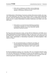 Drucksache 7/1518 Landtag Mecklenburg-Vorpommern - 7. Wahlperiode 2. Welche Zahl von Schülerinnen und Schülern wurde der Meldeschule bis zum 30. September 2017 mitgeteilt, weil sie eine berufliche Schule außerhalb von Mecklenburg-Vorpommern besucht? Acht Meldeschulen in Mecklenburg-Vorpommern erhielten Informationen darüber, dass insge- samt zwölf Schülerinnen und Schüler eine berufliche Schule in einem anderen Bundesland besuchen. Nicht alle Schülerinnen und Schüler melden sich an der Meldeschule ab. Ein unbe- kannter Teil der in anderen Bundesländern beschulten Schülerinnen und Schüler wird somit nicht erfasst. 3. Welche Zahl der von im Jahr 2017 berufsschulpflichtigen Jugendlichen ist mit Stichtag 30. September 2017 weder an einer beruflichen Schule in Mecklenburg-Vorpommern noch an einer Berufsschule außerhalb Mecklenburg-Vorpommerns gemeldet? Die Frage kann nicht beantwortet werden, weil die Zahl der Schülerinnen und Schüler, die in anderen Bundesländern die Berufsschulpflicht erfüllen, nur dann erfasst wird, wenn sie sich bei den Meldeschulen zurückmelden. Gleichzeitig erfüllen gegenwärtig auch Schülerinnen und Schüler anderer Bundesländer in Mecklenburg-Vorpommern die Berufsschulpflicht. Siehe Antwort zu Frage 2. 4. Wie viele Erziehungsberechtigte von Schülerinnen und Schülern, die nach Feststellungen des Datenabgleichs gemäß § 6 Berufsschulpflicht- verordnung Mecklenburg-Vorpommern im Schuljahr 2016/2017 nicht an einer beruflichen Schule angemeldet waren, wurden schriftlich angehört? Die Berufsschulpflichtverordnung vom 7. Dezember 1997, die im Schuljahr 2016/2017 gültig war, sah einen (elektronischen) Datenabgleich im Sinne des heute gültigen § 6 Absatz 2 nicht vor. Da die neue Verordnung erst vor kurzem in Kraft getreten ist und im Übrigen nicht rück- wirkend angewendet werden kann, kann die Frage 4 nicht beantwortet werden. 2