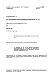 LANDTAG MECKLENBURG-VORPOMMERN Drucksache 7/823 7. Wahlperiode 28.07.2017 KLEINE ANFRAGE des Abgeordneten Thomas de Jesus Fernandes, Fraktion der AfD Ingenieure in Mecklenburg-Vorpommern und ANTWORT der Landesregierung 1. Wie entwickelte sich die Zahl der staatlich anerkannten Ingenieure mit einem Diplom oder Masterabschluss in Mecklenburg-Vorpommern seit 1992? Daten im Sinne der Fragestellung liegen der Landesregierung nicht vor. 2. Wie entwickelte sich die Zahl der jährlichen Absolventen in Ingenieurstudiengängen an Universitäten oder Hochschulen in Mecklenburg-Vorpommern seit 1992 (bitte auflisten nach Jahr, Studiengang und akademischem Grad)? Das Statistische Amt Mecklenburg-Vorpommern kann auf Daten ab 2002 zurückgreifen. Die Angaben können der folgenden Tabelle entnommen werden. Angaben für den Zeitraum von 1992 bis 2001 liegen nicht vor. Der Minister für Wirtschaft, Arbeit und Gesundheit hat namens der Landesregierung die Kleine Anfrage mit Schreiben vom 27. Juli 2017 beantwortet.