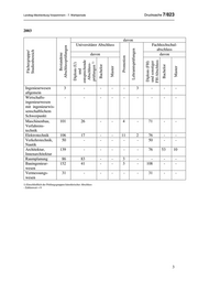 Landtag Mecklenburg-Vorpommern - 7. Wahlperiode Drucksache 7/823 2003 davon Universitärer Abschluss Fachhochschul- Bestandene abschluss Lehramtsprüfungen Fächergruppe/ davon davon Promotion Diplom (U) Diplom (FH) Studienbereich Abschlussprüfungen Bachelor Bachelor und entsprechende Master und sonstiger Master Abschluss- prüfungen 1) FH-Abschluss Ingenieurwesen 3 - - - - 3 - - - allgemein Wirtschafts- - - - - - - - - - ingenieurwesen mit ingenieurwis- senschaftlichem Schwerpunkt Maschinenbau, 101 26 - - 4 - 71 - - Verfahrens- technik Elektrotechnik 106 17 - - 11 2 76 - - Verkehrstechnik, 50 - - - - - 50 - - Nautik Architektur, 139 - - - - - 76 53 10 Innenarchitektur Raumplanung 86 83 - - 3 - - - - Bauingenieur- 152 41 - - 3 - 108 - - wesen Vermessungs- 31 - - - - - 31 - - wesen 1) Einschließlich der Prüfungsgruppen künstlerischer Abschluss - Zahlenwert = 0 3