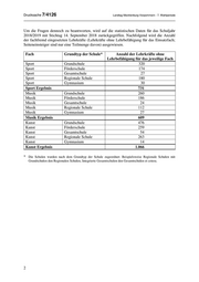 LANDTAG MECKLENBURG-VORPOMMERN Drucksache 7/4126 7. Wahlperiode 01.10.2019 KLEINE ANFRAGE der Abgeordneten Simone Oldenburg, Fraktion DIE LINKE Lehrkräfte ohne Lehrbefähigung für die Fächer Sport, Musik sowie Kunst und Gestaltung und ANTWORT der Landesregierung Vorbemerkung Die Landesregierung sieht die vorrangige Aufgabe der Schulen in der pädagogischen Arbeit und ist deshalb bestrebt, den Aufwand bezüglich Verwaltung und Statistik auf das Maß zu beschränken, welches für die Steuerung und Aufsicht der Schulverwaltungsprozesse unabdingbar ist. Welche Zahl von Lehrkräften unterrichtet an den allgemeinbildenden Schulen a) das Fach Sport. b) das Fach Musik, c) das Fach Kunst und Gestaltung ohne dass diese über die Lehrbefähigung für das jeweilige Fach verfügen (bitte nach Schularten getrennt aufführen)? Darüber, wie viele Lehrkräfte aktuell in den erfragten Fächern unterrichten, liegen der Landesregierung noch keine Daten vor. Die Schulen melden die statistischen Daten für das aktuelle Schuljahr (2019/2020) mit Stichtag 6. September 2019 bis zum 5. November 2019 an das Statistische Amt Mecklenburg-Vorpommern. Im Anschluss erfolgt die Plausibilisierung der Daten durch das Statistische Amt. Belastbare plausibilisierte und ausgewertete Daten für jedes Schuljahr liegen erst zum Ende eines Schuljahres vor. Die Ministerin für Bildung, Wissenschaft und Kultur hat namens der Landesregierung die Kleine Anfrage mit Schreiben vom 30. September 2019 beantwortet.
