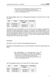 Landtag Mecklenburg-Vorpommern - 6. Wahlperiode Drucksache 6/692 2. Wie haben sich die Stationsgebühren seit Januar 2010 entwickelt und wie hoch fallen sie aus (bitte eine jährliche Auflistung) und a) gibt es Unterschiede zwischen Fernverkehrszügen und SPNV und b) wenn ja, worin begründen sie sich? Die Stationsgebühren haben sich in Mecklenburg-Vorpommern seit Januar 2010 wie folgt entwickelt: Jahr Kosten Differenz zum Abweichung Vorjahr 2010 18,158 Mio. € 2011 17,554 Mio. € -0,604 Mio. € -3,3 % 2012 17,841 Mio. € 0,287 Mio. € 1,6 % Die Reduzierung der Stationsgebühren in 2011 beruht auf einer einmaligen grundsätzlichen Änderung des Stationspreissystems aufgrund von Vorgaben der Bundesnetzagentur, von denen unter anderem Mecklenburg-Vorpommern profitiert hat. Über mehrere Jahre gesehen sind die Stationsgebühren jährlich um zirka 2,0 Prozent gestiegen. Nach den Ankündigungen der DB Station&Service AG für die Zukunft ist auch in den kommenden Jahren mit einer Steigerung um 2,0 Prozent pro Jahr zu rechnen. Zu a) und b) Die Fragen 2 a) und 2 b) werden zusammenhängend beantwortet. Bezüglich der Stationsgebühren gibt es keine Unterschiede zwischen Fernverkehrszügen und SPNV. 3. Die Regionalfaktoren im Trassenpreissystem (TPS) der DB Netz AG wurden ab dem 11. Dezember 2011 abgeschafft. Wie haben sich die Trassengebühren seit Januar 2010 entwickelt und wie hoch fallen sie aus (bitte eine jährliche Auflistung) und a) gibt es Unterschiede zwischen Fernverkehrszügen und SPNV und b) wenn ja, worin begründen sie sich? Die Trassengebühren haben sich seit Januar 2010 wie folgt entwickelt: Jahr Kosten Differenz zum Abweichung Vorjahr 2010 81,314 Mio. € 2011 82,966 Mio. € 1,652 Mio. € 2,0 % 2012 84,835 Mio. € 1,869 Mio. € 2,3 % 3