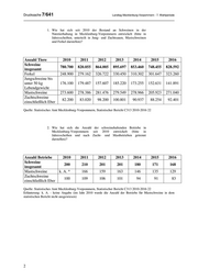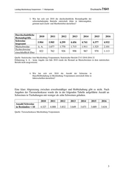 Landtag Mecklenburg-Vorpommern - 7. Wahlperiode Drucksache 7/641 3. Wie hat sich seit 2010 die durchschnittliche Bestandsgröße der schweinehaltenden Betriebe entwickelt (bitte in Jahresangaben, getrennt nach Zucht- und Mastbetrieben darstellen)? Durchschnittliche 2010 2011 2012 2013 2014 2015 2016 Bestandsgröße Schweine 3.904 3.905 4.299 4.456 4.741 4.377 4.932 insgesamt Mastschweine k. A. 1.677 1.770 1.715 1.911 1.525 2.101 Zuchtschweine 822 762 926 998 967 970 1.113 einschließlich Eber Quelle: Statistisches Amt Mecklenburg-Vorpommern, Statistischer Bericht C313 2010-2016 22 Erläuterung: k. A. - keine Angabe (im Jahr 2010 wurde der Bestand an Mastschweinen in dem statistischen Bericht nicht ausgewiesen) 4. Wie hat sich seit 2010 die Anzahl der Schweine in Haus/Hobbyhaltung in Mecklenburg-Vorpommern entwickelt (bitte in Jahresscheiben darstellen)? Eine klare Abgrenzung zwischen erwerbsmäßiger und Hobbyhaltung gibt es nicht. Nach Angaben der Tierseuchenkasse wurde die in der folgenden Tabelle aufgeführte Anzahl an Schweinen in Tierhaltungen mit weniger als zehn Schweinen gehalten. 2010 2011 2012 2013 2014 2015 2016 Anzahl Schweine in Beständen < 10 4.327 4.008 3.832 3.649 3.673 3.689 3.634 Quelle: Tierseuchenkasse Mecklenburg-Vorpommern 3