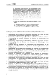 Drucksache 7/2794 Landtag Mecklenburg-Vorpommern - 7. Wahlperiode Die Ministerin für Soziales, Integration und Gleichstellung des Landes Mecklenburg-Vorpommern hat am 25. Oktober 2018 im Landtag sowie in ihrer Pressemitteilung Nummer 220 ein Maßnahmepaket für mehr Trans- parenz, Steuerung und Kontrolle in der Freien Wohlfahrtspflege ange- kündigt. Neben einem Wohlfahrtsfinanz- und -transparenzgesetz, das für 2019 angekündigt wurde, sollen bereits zum 1. Januar 2019 zehn über- arbeitete Richtlinien über die Gewährung von Zuwendungen an Verbände und Vereine der Freien Wohlfahrtspflege in Kraft treten. Dabei wird von Zuwendungsempfängern, die mehr als 25.000 Euro Landesförderung erhalten, gefordert bzw. erwartet, dass sie der „Initiative Transparente Zivilgesellschaft“ beitreten. 1. Welche zehn Richtlinien sollen zum 1. Januar 2019 geändert in Kraft treten? a) Mit welchem konkreten Ziel werden die Richtlinien geändert? b) In welchen Punkten sollen die Richtlinien geändert werden? c) Wann sollen die geänderten Richtlinien veröffentlicht werden? Nachfolgend genannte Richtlinien sollen zum 1. Januar 2019 geändert in Kraft treten: 1. Richtlinie über die Gewährung von Zuwendungen an Verbände und Vereine der Freien Wohlfahrtspflege für ehrenamtliche Mitarbeit (vom 27. März 2014), 2. Richtlinie über die Gewährung von Zuwendungen an Verbände und Vereine der Freien Wohlfahrtspflege für ambulante Maßnahmen für Menschen mit Behinderungen (vom 27. März 2014), 3. Richtlinie über die Gewährung von Zuwendungen an Verbände und Vereine der Freien Wohlfahrtspflege für die Beratung von Menschen mit Behinderungen (vom 27. März 2014), 4. Richtlinie über die Gewährung von Zuwendungen zur Projektförderung für die Integration von Migrantinnen und Migranten in Mecklenburg-Vorpommern (vom 27. März 2014), 5. Richtlinie über die Gewährung von Zuwendungen zur Förderung der gesellschaftlichen Integration von Flüchtlingen und des Zusammenlebens in den kreisfreien Städten, Land- kreisen, kreisangehörigen Städte, Ämtern und Gemeinden in Mecklenburg-Vorpommern (Richtlinie-Integrationsfonds) (vom 2. August 2017), 6. Richtlinie zur Förderung von allgemeiner sozialer Beratung in Mecklenburg- Vorpommern (vom 4. November 2009, geändert durch Verwaltungsvorschrift des Minis- teriums für Arbeit, Gleichstellung und Soziales vom 16. Dezember 2013), 7. Richtlinie über die Gewährung von Zuwendungen an Verbände und Vereine der Freien Wohlfahrtspflege zur Hilfe für Menschen in kritischen Lebenssituationen durch ambu- lante Maßnahmen (vom 27. März 2014), 8. Richtlinie über die Gewährung von Zuwendungen an Verbände und Vereine der Freien Wohlfahrtspflege für Krisenintervention (vom 27. März 2014), 9. Richtlinie zur Förderung von Schuldner-/Verbraucherinsolvenzberatungsstellen in Mecklenburg-Vorpommern (vom 12. Juli 2013, geändert durch Verwaltungsvorschrift des Ministeriums für Soziales, Integration und Gleichstellung vom 16. November 2017), 10. Richtlinie über die Gewährung von Zuwendungen für die Förderung der in der LIGA der Spitzenverbände der Freien Wohlfahrtspflege zusammengeschlossenen Landesverbände (vom 27. März 2014). 2