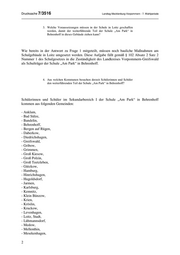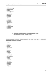 Drucksache 7/3516 Landtag Mecklenburg-Vorpommern - 7. Wahlperiode 3. Welche Voraussetzungen müssen in der Schule in Loitz geschaffen werden, damit der weiterführende Teil der Schule „Am Park“ in Behrenhoff in dieses Gebäude ziehen kann? Wie bereits in der Antwort zu Frage 1 mitgeteilt, müssen noch bauliche Maßnahmen am Schulgebäude in Loitz umgesetzt werden. Diese Aufgabe fällt gemäß § 102 Absatz 2 Satz 2 Nummer 1 des Schulgesetzes in die Zuständigkeit des Landkreises Vorpommern-Greifswald als Schulträger der Schule „Am Park“ in Behrenhoff. 4. Aus welchen Kommunen besuchen derzeit Schülerinnen und Schüler den weiterführenden Teil der Schule „Am Park“ in Behrenhoff? Schülerinnen und Schüler im Sekundarbereich I der Schule „Am Park“ in Behrenhoff kommen aus folgenden Gemeinden: - Anklam, - Bad Sülze, - Bandelin, - Behrenhoff, - Bergen auf Rügen, - Daberkow, - Diedrichshagen, - Greifswald, - Gribow, - Grimmen, - Groß Kiesow, - Groß Polzin, - Groß Teetzleben, - Gützkow, - Hamburg, - Hinrichshagen, - Hugoldsdorf, - Jarmen, - Karlsburg, - Kemnitz, - Klein Bünzow, - Krien, - Kröslin, - Kruckow, - Levenhagen, - Loitz, Stadt, - Lühmannsdorf, - Medow, - Mellenthin, - Mesekenhagen, 2