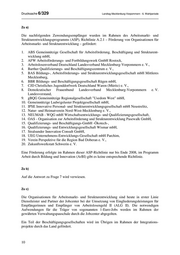 Drucksache 6/329 Landtag Mecklenburg-Vorpommern - 6. Wahlperiode Zu a) Die nachfolgenden Zuwendungsempfänger wurden im Rahmen des Arbeitsmarkt- und Strukturentwicklungsprogramms (ASP), Richtlinie A.2.1 – Förderung von Organisationen für Arbeitsmarkt- und Strukturentwicklung – gefördert: 1. ABS Gemeinnützige Gesellschaft für Arbeitsförderung, Beschäftigung und Strukturent- wicklung mbH, 2. AFW Arbeitsförderungs- und Fortbildungswerk GmbH Rostock, 3. Arbeitslosenverband Deutschland Landesverband Mecklenburg-Vorpommern e. V., 4. Barther Qualifizierungs- und Beschäftigungszentrum e. V., 5. BAS Bildungs-, Arbeitsförderungs- und Strukturentwicklungsgesellschaft mbH Mittleres Mecklenburg, 6. BBR Bildungs- und Beschäftigungsgesellschaft Rügen mbH, 7. CJD Christliches Jugenddorfwerk Deutschland Waren (Müritz) e. V., 8. Demokratischer Frauenbund Landesverband Mecklenburg-Vorpommern e. V. Landesvorstand, 9. gBQG Gemeinnützige Regionalgesellschaft "Usedom West" mbH, 10. Gemeinnützige Ludwigsluster Projektgesellschaft mbH, 11. IPSE Innovative Personal- und Strukturentwicklungsgesellschaft mbH Neustrelitz, 12. Natur- und Heimatverein Nord-West-Mecklenburg e. V., 13. NEUMAB - WQG mbH Wirtschaftsentwicklungs- und Qualifizierungsgesellschaft, 14. OAS - Organisation zur Arbeitsförderung und Strukturentwicklung Pasewalk GmbH, 15. Qualifizierungs- und Beschäftigungs-GmbH -Ökotech-, 16. Qualifizierungs- und Entwicklungsgesellschaft Wismar mbH, 17. Stralsunder Innovation Consult GmbH, 18. UEG Unternehmens-Entwicklungs-Gesellschaft mbH Parchim, 19. Verein Perspektive für die Region Bad Doberan e. V., 20. Zukunftswerkstatt Schwerin e. V. Eine Förderung erfolgte im Rahmen dieser ASP-Richtlinie nur bis Ende 2008, im Programm Arbeit durch Bildung und Innovation (ArBI) gibt es keine entsprechende Richtlinie. Zu b) Auf die Antwort zu Frage 7 wird verwiesen. Zu c) Die Organisationen für Arbeitsmarkt- und Strukturentwicklung sind heute in erster Linie Dienstleister und Partner der Jobcenter bei der Umsetzung von Eingliederungsleistungen für Empfängerinnen und Empfänger von Arbeitslosengeld II (ALG II). Die notwendigen Aufwendungen für die Träger von sogenannten 1-Euro-Jobs werden im Rahmen der gewährten Verwaltungspauschale durch die Jobcenter abgegolten. Ein Teil der Beschäftigungsgesellschaften wird im Übrigen im Rahmen der Integrations- projekte durch das Land gefördert. 10