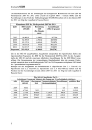 Drucksache 6/329 Landtag Mecklenburg-Vorpommern - 6. Wahlperiode Die Haushaltsansätze für die Erstattungen der Europäischen Kommission für den ESF der Förderperiode 2007 bis 2013 (Titel 272.60 im Kapitel 1004 – vormals 0608) und die Auszahlungen in den Titeln der Maßnahmegruppe 60 (MG 60) stellen sich in den Jahren 2007 bis 2011 wie folgt dar (Angaben in Tausend Euro): Einnahmen ESF der Förderperiode 2007 bis 2013 Jahr HH-Ansatz Erstattung Auszahlungen (272.60) ESF (MG 60 gesamt) (Ist-Einnah- men) 2007 16.405,0 8.349,5 9.773,6 2008 62.407,0 12.524,2 22.464,0 2009 89.137,6 10.436,8 70.187,8 2010 70.675,6 334,6 80.223,4 2011 54.917,7 13.755,8 53.625,5 Insgesamt 293.542,9 45.400,9 236.274,3 Die in der MG 60 ausgebrachten Ausgabetitel entsprechen den Spezifischen Zielen des Operationellen Programms des ESF für die Förderperiode 2007 bis 2013. In den Ausgabe- titeln der MG 60 sind die erwarteten jährlichen Auszahlungen für die ESF-Mittel veran- schlagt. Die Gesamtsumme der veranschlagten Haushaltsmittel über die gesamte Förder- periode entspricht dem in der Förderperiode 2007 bis 2013 insgesamt verfügbaren ESF-Mittel des Operationellen Programms des ESF. Bezogen auf die Ausgabetitel der Prioritätsachse C (Spezifisches Ziel C.1: Titel 683.63, Spezifisches Ziel C.2: Titel 684.65, Spezifisches Ziel C.3: Titel 684.62) stellen sich die Ansätze und die Auszahlungen in den Jahren 2007 bis 2011 wie folgt dar (alle Angaben in Tausend Euro): Titel 683.63: Spezifisches Ziel C.1 Arbeitslosen Frauen und Männern den Zugang zur Erwerbstätigkeit erleichtern Jahr HH-Ansatz übertragener Inanspruchnahme Auszahlungen gebildeter Rest (683.63) Rest Deckungsfähigkeit 2007 505,3 0,0 505,3 2008 4.734,0 505,3 89,3 5.150,0 2009 2.774,9 5.150,0 -1.270,4 949,8 5.704,7 2010 2.877,2 5.704,7 -4.489,4 1.149,0 2.943,5 2011 2.849,6 2.943,5 -3.000,0 1.385,5 1.407,6 2