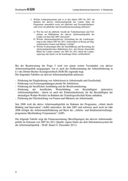 Drucksache 6/329 Landtag Mecklenburg-Vorpommern - 6. Wahlperiode 3. Welche Landesprogramme gab es in den Jahren 2007 bis 2011 im Rahmen der aktiven Arbeitsmarktpolitik des Landes (bitte die Programme namentlich sowie mit jährlicher und Gesamtteilnehmer- zahl sowie mit jährlicher und Gesamtfinanzausstattung auflisten)? a) Wie hat sich die jährliche Anzahl der Teilnehmerinnen und Teil- nehmer an Maßnahmen der aktiven Arbeitsmarktpolitik des Landes seit dem Jahr 2007 entwickelt? b) Welche arbeitsmarktpolitische Zielstellung hat die Landesregie- rung in den Jahren 2007 bis 2011, insbesondere in Bezug auf lang- zeitarbeitslose Frauen und Männer verfolgt? c) Welche Evaluierungen über die Durchführung und Bewertung der arbeitsmarktpolitischen Maßnahmen bzw. den Einsatz finanzieller Mittel des Landes wurden von 2007 bis 2011 durch die Landes- regierung oder durch von ihr beauftragte Dritte veröffentlicht? Bei der Beantwortung der Frage 3 wird von einem weiten Verständnis von aktiver Arbeitsmarktpolitik ausgegangen, wie es auch der Zielbestimmung der Arbeitsförderung in § 1 des Dritten Buches Sozialgesetzbuch (SGB III) zugrunde liegt. Die folgenden Tabellen zur aktiven Arbeitsmarktpolitik umfassen: - Förderung der Eingliederung von Arbeitslosen in Arbeitsmarkt und Gesellschaft, - Förderung von Existenzgründungen primär für Arbeitslose, - Förderung der beruflichen Ausbildung und der Berufsorientierung, - Förderung der beruflichen Weiterbildung von Beschäftigten (präventive Arbeitsmarktpolitik) - hierin ist auch der Fördermitteleinsatz für die Beschäftigten der ehemaligen Wadan-Werften im Rahmen der Transfergesellschaft Küste enthalten, - Förderung der Gleichstellung von Frauen und Männern am Arbeitsmarkt. Seit 2008 wird die aktive Arbeitsmarktpolitik im Rahmen des Programms „Arbeit durch Bildung und Innovation" (ArBI) unterstützt. Im Jahr 2007 und teilweise auch noch im Jahr 2008 erfolgte die Arbeitsmarktförderung auf Basis des „Arbeits- und Strukturentwicklungs- programms Mecklenburg-Vorpommern" (ASP). Die folgende Tabelle zeigt die Finanzausstattung (Bewilligungen) der aktiven Arbeitsmarkt- politik im Zeitraum von 2007 bis 2011 (Quelle: eigene Daten aus dem Informationssystem für die Arbeitsmarktpolitik – ISAP, Stand 31. Dezember 2011): 4