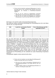 Drucksache 6/329 Landtag Mecklenburg-Vorpommern - 6. Wahlperiode 5. Wie hat sich die Anzahl der anerkannten Bildungsträger im Land in den Jahren 2007 bis 2011 entwickelt (bitte insgesamt sowie davon Bildungsträger mit Firmensitz in Mecklenburg-Vorpommern angeben)? a) Wie hat sich die Anzahl der tarifgebundenen anerkannten Bildungsträger im Land in den Jahren 2007 bis 2011 entwickelt? b) Wie hat sich die Anzahl der Beschäftigten der anerkannten Bildungsträger im Land in den Jahren 2007 bis 2011 entwickelt? Die Fragen 5, 5a) und 5b) werden im Zusammenhang beantwortet. Die Anzahl der staatlich anerkannten Einrichtungen der Weiterbildung hat sich in den Jahren 2007 bis 2011 wie folgt entwickelt: Jahr Anzahl der anerkannten Einrich- Davon Einrichtungen mit Sitz tungen außerhalb von M-V 2007 205 2008 208 2009 219 2010 223 2011 227 3 Bis zum Jahr 2010 hatten alle staatlich anerkannten Einrichtungen ihren Sitz im Land Mecklenburg-Vorpommern. Eine Anerkennung von Einrichtungen mit Sitz außerhalb des Landes Mecklenburg-Vorpommern war zu diesem Zeitpunkt rechtlich nicht möglich. Das Weiterbildungsgesetz des Landes Mecklenburg-Vorpommern (WBG M-V) schrieb in § 7 Absatz 1 Nummer 1 zwingend vor, dass die Einrichtung ihren Sitz und hauptsächlichen Arbeitsbereich im Land Mecklenburg-Vorpommern haben musste. Erst mit der Veröffent- lichung des „Gesetzes zur Umsetzung der Richtlinie 2006/123/EG über Dienstleistungen im Binnenmarkt in Mecklenburg-Vorpommern“ vom 17. Dezember 2009 wurde § 7 des WBG M-V dahingehend geändert, dass nunmehr nicht nur die Einrichtungen mit Sitz in Mecklenburg-Vorpommern anerkannt werden dürfen. Im Jahr 2011 wurden erstmalig drei Einrichtungen der Weiterbildung mit Sitz außerhalb des Landes Mecklenburg-Vorpommern anerkannt. Weitergehende Angaben werden statistisch nicht erfasst. 6. Wie hat sich die Anzahl der im Land tätigen Beschäftigungsgesell- schaften in den Jahren 2007 bis 2011 entwickelt? a) Wie hat sich die Anzahl der Beschäftigten (Stammpersonal) der Beschäftigungsgesellschaften in den Jahren 2007 bis 2011 ent- wickelt? b) Welche Aufgaben nehmen die Beschäftigungsgesellschaften aus Sicht bzw. im Auftrag des Landes wahr? Auf die Antwort zu Frage 4 wird verwiesen. 8