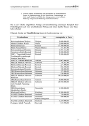 Drucksache 6/314 Landtag Mecklenburg-Vorpommern - 6. Wahlperiode Krankenhaus Ort Antragshöhe in Euro Kreiskrankenhaus Hagenow Hagenow 225.000,00 Klinikum Südstadt Rostock 3.200.000,00 Klinikum Südstadt Rostock 5.400.000,00 Ev. Krankenhaus 620.000,00 Stift Bethlehem Ludwigslust Asklepios Klinik Parchim Parchim 1.632.000,00 KMG Kliniken Güstrow Güstrow 510.585,68 Warnow-Klinik Bützow Bützow 1.500.000,00 KMG Kliniken Güstrow Güstrow 395.777,00 KMG Kliniken Güstrow Güstrow 877.224,00 DRK Krankenhaus Grimmen Grimmen 1.800.000,00 BDH-Klinik Greifswald Greifwald 7.005.000,00 Krankenhaus Bad Doberan Bad Doberan 25.500.000,00 Stand: 15.02.2012 Pauschalfördermittel werden jährlich bewilligt. Es liegen von allen Krankenhäusern die pauschalen Anträge vor. 3. Welche der in Frage 2 genannten Vorhaben finden Eingang in die Haushaltsplanung der Jahre 2012/2013? Die im Haushaltsplan-Entwurf 2012/2013 veranschlagten Ansätze entsprechen dem Niveau der bisherigen Mittelfristigen Finanzplanung und berücksichtigen neben den bestehenden Bindungen aus Fördermittelentscheidungen der Vergangenheit den vom Land und den Kommunen finanzierbaren weiteren Investitionsbedarf. Über die Prioritätensetzung für die Bewilligung der freien Fördermittel wird im Rahmen des jährlich im Einvernehmen mit den Planungsbeteiligten aufzustellenden Investitionsprogramms entschieden. 4