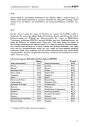 Landtag Mecklenburg-Vorpommern - 6. Wahlperiode Drucksache 6/3870 Zu a) Frauen haben in Mecklenburg-Vorpommern eine deutlich höhere Lebenserwartung als Männer, deren Lebenserwartung im Zeitraum 1993/1995 bis 2005/2007 allerdings stärker anstieg als die der Frauen. Seit 2006/2008 ist der Anstieg bei Männern und Frauen etwa gleich. Zu b) Bei der Lebenserwartung ist weniger ein Ost-West- als vielmehr ein Nord-Süd-Gefälle zu beobachten. So weisen die Länder Baden-Württemberg, Bayern und Hessen die höchste Lebenserwartung aus. Während die Lebenserwartung der Frauen in Mecklenburg- Vorpommern im Zeitraum 2009/2011 nur noch 0,4 Jahre unter dem Bundesdurchschnitt lag, betrug die Differenz bei Männern noch 2 Jahre. Mit 75,86 Jahren hatten die Männer in Mecklenburg-Vorpommern mit Sachsen-Anhalt (75,71 Jahre) die geringste Lebenserwartung. Die Ursachen sind vielfältig und in ihrem Ausmaß nicht konkret ausweisbar. Zum einem wirkt sich der sozioökonomische Status aus. Die Länder mit dem höchsten Pro-Kopf- Einkommen haben (außer Hamburg) auch die höchste Lebenserwartung. Zum anderen haben der persönliche Lebensstil und gesundheitsrelevante Verhaltensweisen erheblichen Einfluss auf die Lebenserwartung. Lebenserwartung zum Zeitpunkt der Geburt, Zeitraum 2009/2011 Männer Frauen Baden-Württemberg 79,15 Baden-Württemberg 83,64 Hessen 78,42 Sachsen 83,24 1) 1) Bayern 78,09 Bayern 83,00 Rheinland-Pfalz 77,73 Hessen 82,90 Deutschland 77,72 Deutschland 82,73 Hamburg 77,63 Hamburg 82,56 Berlin 77,60 Berlin 82,55 Schleswig-Holstein 77,46 Brandenburg 82,44 Niedersachsen 77,42 Rheinland-Pfalz 82,42 Nordrhein-Westfalen 77,31 Niedersachsen 82,41 Sachsen 77,29 Thüringen 82,33 Brandenburg 76,97 Mecklenburg-Vorpommern 82,31 Saarland 76,70 Schleswig-Holstein 82,26 Thüringen 76,68 Nordrhein-Westfalen 82,20 Bremen 76,51 Bremen 82,05 Mecklenburg-Vorpommern 75,86 Sachsen-Anhalt 81,86 Sachsen-Anhalt 75,71 Saarland 81,71 1) Zeitraum 2008/2010, Quelle : Statistisches Bundesamt. 11