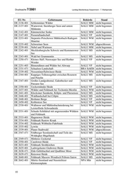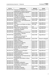 Landtag Mecklenburg-Vorpommern - 7. Wahlperiode Drucksache 7/3981 EU-Nr. Gebietsname Behörde Stand DE 1940-301 Teufelsmoor bei Horst StALU MM abgeschlossen DE 1941-301 Recknitz- und Trebeltal mit Zuflüssen StALU VP abgeschlossen DE 1946-301 Wälder um Greifswald StALU VP abgeschlossen DE 1946-302 Greifswald-Eldena, Bierkeller LM in Bearbeitung DE 1950-301 Wocknin-See StALU VP abgeschlossen DE 2031-301 Küste Klützer Winkel und Ufer von StALU WM abgeschlossen Dassower See und Trave DE 2032-301 Lenorenwald StALU WM abgeschlossen DE 2035-301 Wismar-Müggenburg, Tischlerei LM in Bearbeitung DE 2036-301 Züsower Wald StALU WM abgeschlossen DE 2036-302 Kleingewässerlandschaft bei Kirch StALU MM abgeschlossen Mulsow DE 2037-301 Beketal mit Zuflüssen StALU MM abgeschlossen DE 2038-301 Kleingewässerlandschaft an den StALU MM abgeschlossen Letschower Tannen (bei Schwaan) DE 2039-301 Hohensprenzer, Dudinghausener und StALU MM abgeschlossen Dolgener See DE 2040-301 Kleingewässerlandschaft bei Jahmen StALU MM abgeschlossen DE 2041-301 Griever Holz StALU MM abgeschlossen DE 2044-302 Drosedower Wald und Woldeforst StALU MS abgeschlossen DE 2045-302 Peenetal mit Zuflüssen, StALU VP Entwurf vorliegend Kleingewässerlandschaft am Kummrower See DE 2048-301 Kleingewässerlandschaft am Pinnower StALU VP abgeschlossen See bei Anklam DE 2048-302 Ostvorpommrsche Waldlandschaft mit StALU VP abgeschlossen Brebowbach DE 2049-302 Peeneunterlauf, Peenestrom, StALU VP abgeschlossen Achterwasser und Kleines Haff DE 2050-303 Ostusedomer Hügelland StALU VP abgeschlossen DE 2051-301 Dünenwälder östlich von Ahlbeck StALU VP abgeschlossen (Usedom) DE 2130-302 Herrnburger Binnendüne und StALU WM abgeschlossen Duvennester Moor DE 2130-303 Moore in der Palinger Heide StALU WM abgeschlossen DE 2132-302 Bernstorfer Wald StALU WM abgeschlossen DE 2132-303 Stepenitz-, Radegast- und Maurinetal StALU WM abgeschlossen mit Zuflüssen DE 2133-301 Santower See StALU WM abgeschlossen DE 2133-302 Jameler Wald, Tressower See und StALU WM abgeschlossen Moorsee DE 2133-303 Wald- und Kleingewässerlandschaft StALU WM abgeschlossen Everstorf DE 2134-301 Kleingewässerlandschaft westlich von StALU WM abgeschlossen Dorf Mecklenburg 3