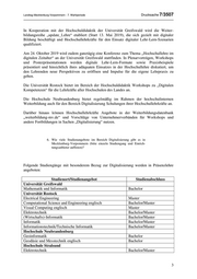 Landtag Mecklenburg-Vorpommern - 7. Wahlperiode Drucksache 7/3507 In Kooperation mit der Hochschuldidaktik der Universität Greifswald wird die Weiter- bildungsreihe „update_Lehre“ etabliert (Start 13. Mai 2019), die sich gezielt mit digitaler Bildung beschäftigt und Hochschullehrkräfte für den Einsatz digitaler Lehr-Lern-Szenarien qualifiziert. Am 24. Oktober 2019 wird zudem ganztägig eine Konferenz zum Thema „Hochschullehre im digitalen Zeitalter“ an der Universität Greifswald stattfinden. In Plenarvorträgen, Workshops und Posterpräsentationen werden digitale Lehr-Lern-Formate sowie Praxisbeispiele präsentiert und hinsichtlich ihres adäquaten Einsatzes in der Hochschullehre diskutiert, um den Lehrenden neue Perspektiven zu eröffnen und Impulse für die eigene Lehrpraxis zu geben. Die Universität Rostock bietet im Bereich der Hochschuldidaktik Workshops zu „Digitalen Kompetenzen“ für die Lehrkräfte aller Hochschulen des Landes an. Die Hochschule Neubrandenburg bietet regelmäßig im Rahmen der hochschulinternen Weiterbildung auch für den Bereich Digitalisierung Schulungen ihrer Hochschullehrkräfte an. Darüber hinaus können Hochschullehrkräfte Angebote in der Weiterbildungsdatenbank „weiterbildung-mv.de“ und Vorschläge von Unternehmerverbänden für Workshops und andere Fortbildungen in Sachen „Digitalisierung“ nutzen. 6. Wie viele Studienangebote im Bereich Digitalisierung gibt es in Mecklenburg-Vorpommern (bitte einzeln Studiengang und Einrich- tungsanbieter auflisten)? Folgende Studiengänge mit besonderem Bezug zur Digitalisierung werden in Präsenzlehre angeboten: Studienort/Studienangebot Studienabschluss Universität Greifswald Mathematik und Informatik Bachelor Universität Rostock Electrical Engineering Master Computational Science and Engineering englisch Bachelor/Master Visual Computing englisch Master Elektrotechnik Bachelor/Master (Wirtschafts)-Informatik Bachelor/Master Informatik Bachelor/Master Informationstechnik/Technische Informatik Bachelor/Master Hochschule Neubrandenburg Geoinformatik Bachelor Geodäsie und Messtechnik englisch Bachelor Hochschule Stralsund Elektrotechnik Bachelor/Master 3