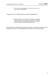 Landtag Mecklenburg-Vorpommern - 7. Wahlperiode Drucksache 7/3507 9. Wie bewertet die Landesregierung die Zahl der Professuren im Ver- gleich zu anderen Bundesländern? Es liegen hierzu keine Vergleichszahlen mit anderen Bundesländern vor. 10. Welche Hochschulen und Universitäten in Mecklenburg-Vorpommern wurden und werden bei der Finanzierung eines Open Acces Publika- tionsfonds durch die Landesregierung unterstützt (bitte einzeln be- nennen und Förderung in Jahrestranchen aufschlüsseln)? Die Hochschulen in Mecklenburg-Vorpommern bestreiten entsprechende Ausgaben für die Einrichtung von Open Access-Publikationsfonds bei Bedarf aus ihrem Grundzuschuss. 5