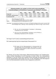 Landtag Mecklenburg-Vorpommern - 7. Wahlperiode Drucksache 7/2705 Medianbruttolöhne und -gehälter in EUR sozialversicherungspflichtig Vollzeitbeschäftigter in Mecklenburg-Vorpommern zum Stichtag 31. Dezember Jahr 2011 2012 2013 2014 2015 2016 2017 insgesamt 1.997 2.058 2.125 2.187 2.249 2.306 2.391 im Schiff- und Bootsbau* 2.958 2.905 3.238 3.321 3.411 3.498 3.590 Leiharbeitskräfte X X 1.486 1.547 1.604 1.603 1.668 * Wirtschaftsgruppe 301 (WZ 08) X Daten zu Leiharbeitskräften sind erst ab 2013 verfügbar. Quelle: Beschäftigungsstatistik der Bundesagentur für Arbeit Anmerkung: Aus methodischen Gründen ist ein Ausweis von Entgeltverteilungen nicht sinnvoll, wenn die Zahl der Beschäftigten unter 1.000 liegt. Auf die Anmerkung in der Antwort zu Frage 3 wird verwiesen. 8. Wie hat sich die durchschnittliche Verleihdauer in Mecklenburg- Vorpommern seit 2011 entwickelt? 9. Wie hat sich die durchschnittliche Verleihdauer auf den Werften in Mecklenburg-Vorpommern seit 2011 entwickelt? Die Fragen 8 und 9 werden zusammenhängend beantwortet. Der Landesregierung liegt kein entsprechendes Datenmaterial vor. 10. Wie konkret will die Ministerpräsidentin im Zusammenwirken mit den Betriebsräten und Gewerkschaften dazu beitragen, die Leih- arbeitsquote auf den Werften zu senken, um auf diese Art und Weise gute Arbeit zu befördern? Die Werften sind mit ihren Tarifverträgen, Mitbestimmungsstrukturen und Ausbildungsakti- vitäten wichtige Unternehmen bei der Umsetzung von guter Arbeit. Um Auftragsspitzen abzufedern, ist auf den Werften auch Leiharbeit derzeit notwendig. Die Betriebsräte vor Ort und die Gewerkschaften achten darauf, dass dies von den Arbeitgebern nicht überstrapaziert wird. Die Ministerpräsidentin unterstützt dieses Engagement ausdrücklich. 3