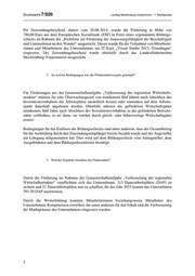 Drucksache 7/926 Landtag Mecklenburg-Vorpommern - 7. Wahlperiode Per Zuwendungsbescheid, datiert vom 20.08.2014, wurde die Förderung in Höhe von 780,00 Euro aus dem Europäischen Sozialfonds (ESF) in Form eines sogenannten Bildungs- schecks im Rahmen der „Richtlinie zur Förderung der Anpassungsfähigkeit der Beschäftigten und Unternehmen an den Wandel“ ausgereicht. Dieser wurde für die Teilnahme von Mitarbeite- rinnen und Mitarbeitern des Unternehmens am IT-Kurs „Visual Studio 2013, Grundlagen“ eingesetzt. Der Zuwendungsbescheid wurde ebenfalls durch das Landesförderinstitut Mecklenburg-Vorpommern ausgereicht. 2. An welche Bedingungen war die Fördermittelvergabe geknüpft? Für Förderungen aus der Gemeinschaftsaufgabe „Verbesserung der regionalen Wirtschafts- struktur“ müssen für eine Überwachungszeit von mindestens fünf Jahren nach Abschluss des Investitionsvorhabens die Arbeitsplätze tatsächlich besetzt oder zumindest auf dem Arbeits- markt dauerhaft angeboten werden. Ebenfalls müssen die geförderten Wirtschaftsgüter mindestens fünf Jahre nach Abschluss des Investitionsvorhabens in der geförderten Betriebs- stätte verbleiben, es sei denn, sie werden durch gleich- oder höherwertige Wirtschaftsgüter ersetzt. Bedingungen für das Einlösen der Bildungsschecks sind unter anderem, dass der Gesamtbetrag für die Ausbildung durch den Zuwendungsempfänger bereits bezahlt wurde und der Angestellte am Lehrgang teilgenommen hat. Dies wird auf dem Bildungsscheck vom Antragsteller, dem Ausgebildeten und dem Bildungsdienstleister bestätigt. 3. Welches Ergebnis brachten die Fördermittel? Durch die Förderung im Rahmen der Gemeinschaftsaufgabe „Verbesserung der regionalen Wirtschaftsstruktur“ verpflichtete sich das Unternehmen, 313 Dauerarbeitsplätze (DAP) zu sichern und 21 Dauerarbeitsplätze neu zu schaffen; für das Jahr 2015 konnte das Unternehmen 391,50 DAP nachweisen. Durch die Weiterbildung konnten Mitarbeiterinnen beziehungsweise Mitarbeiter des Unternehmens Kompetenzen erwerben, die unter anderem für den Erhalt und die Verbesserung der Marktpräsenz des Unternehmens eingesetzt wurden. 2